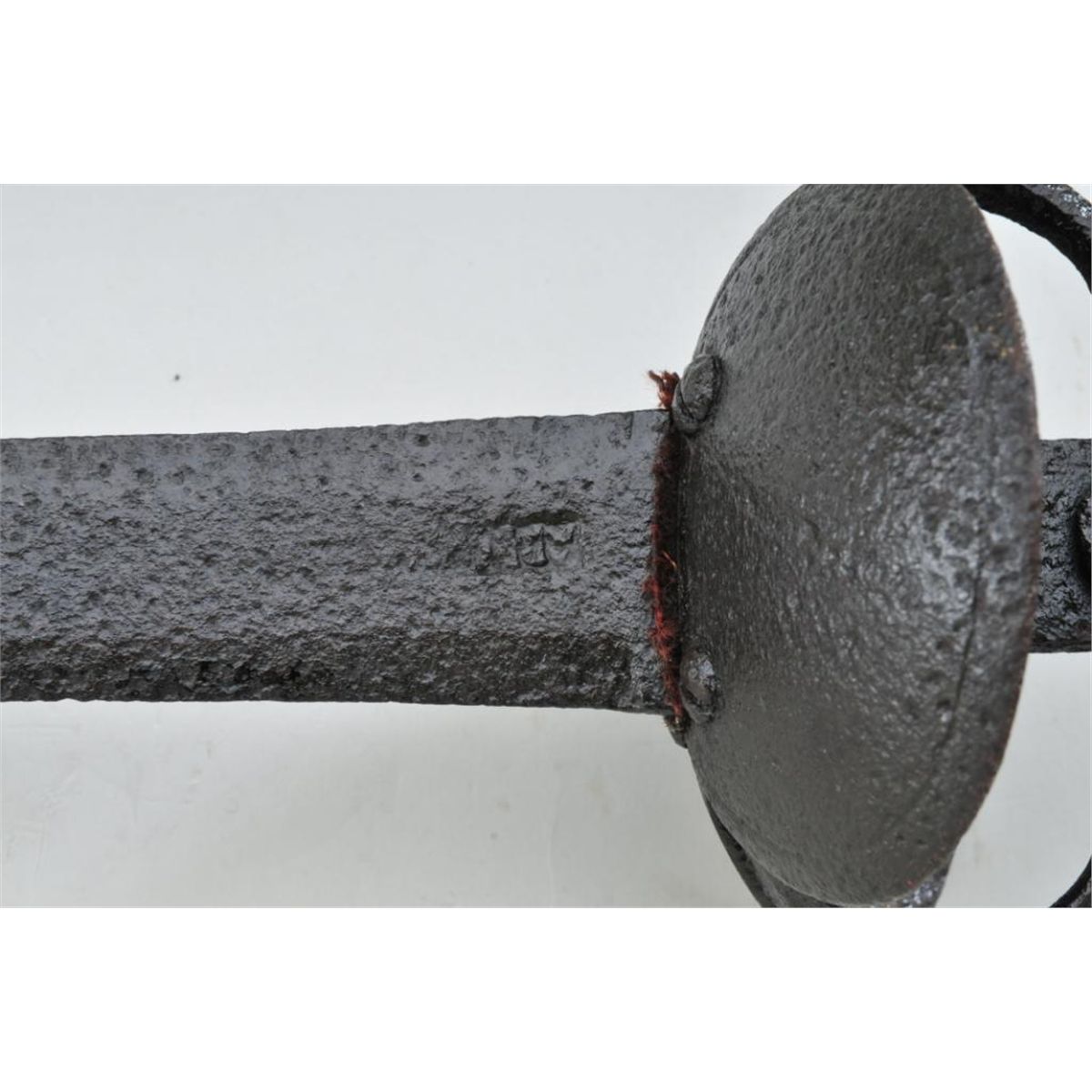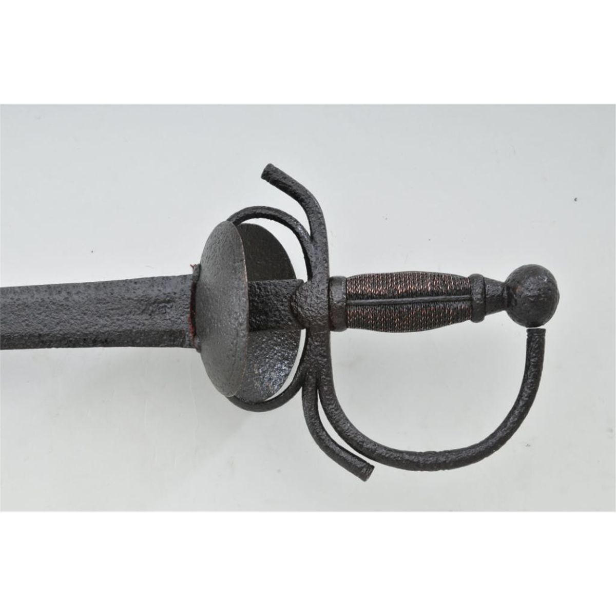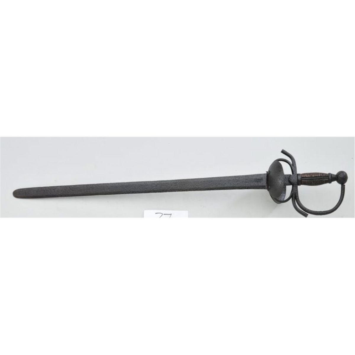 Authentic Spanish cup hilt sword circa 1590-1650, approx. 30” overall with an approx. 23” blade. This early sword is in untouched condition showing a dark black patina over moderate pitting on all ironsurfaces including the blade, guard and pommel; grip is copper-wrapped; the blade is hallmarked at the hilt. A great old piece with lots of character! Est.: $700-$1,400.
