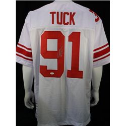 This is a custom New York Giants jersey signed by world champion defensive lineman Justin Tuck. This jersey comes complete with a certificate of authe
