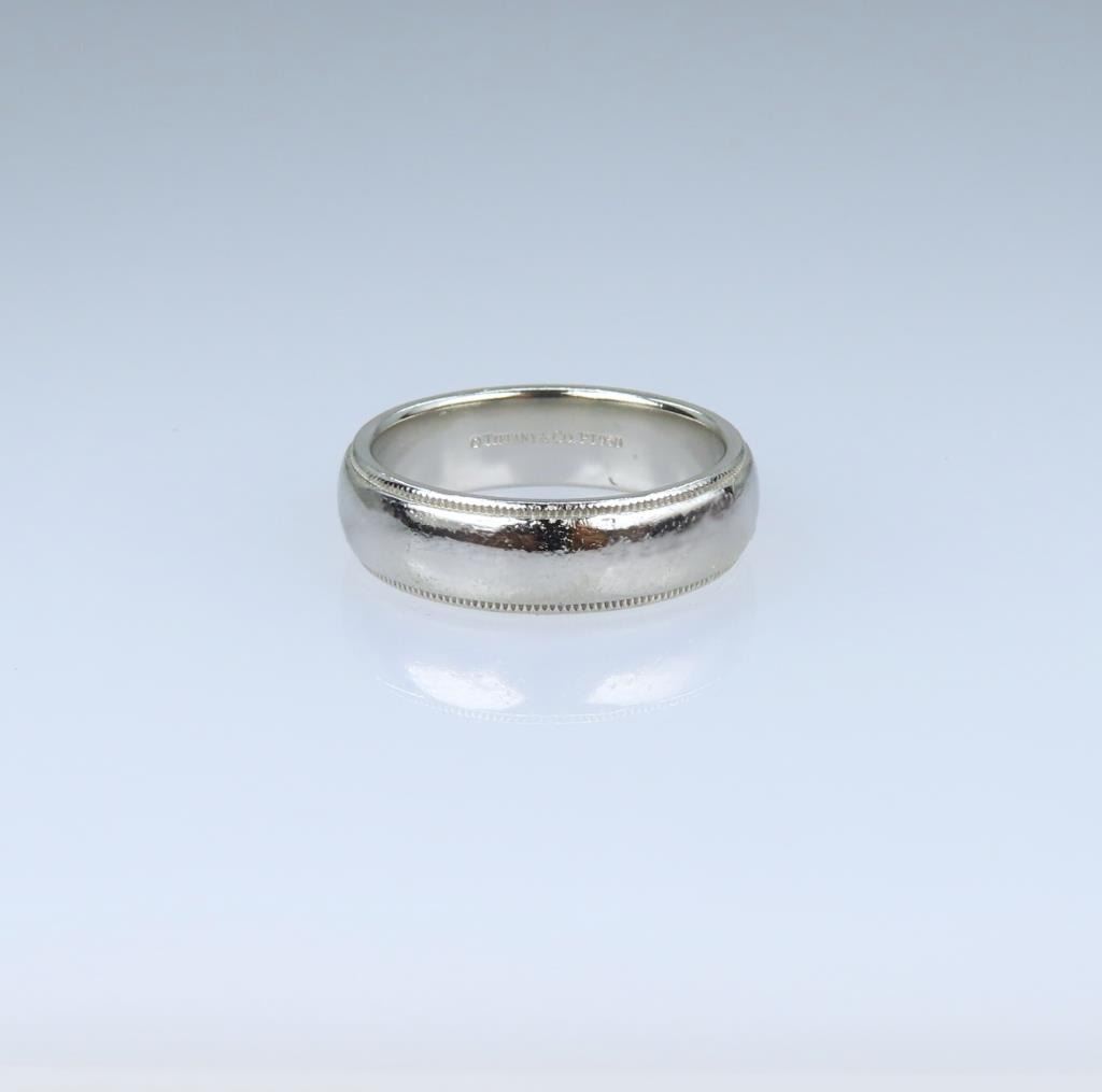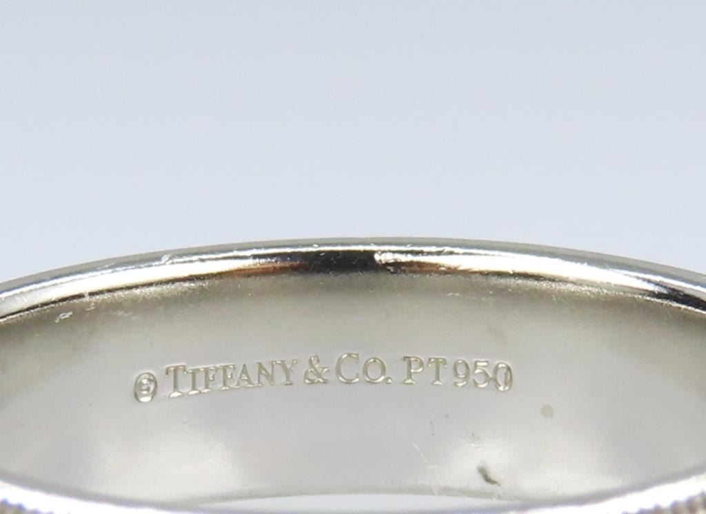 Featuring fine mil grain pattern accents, weighing over 13 grams of Platinum, ring size 8½. New at TIFFANY store over $3,000.00.