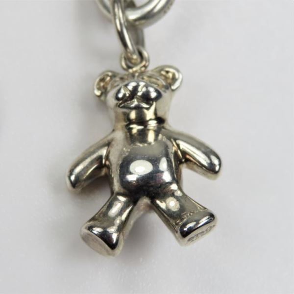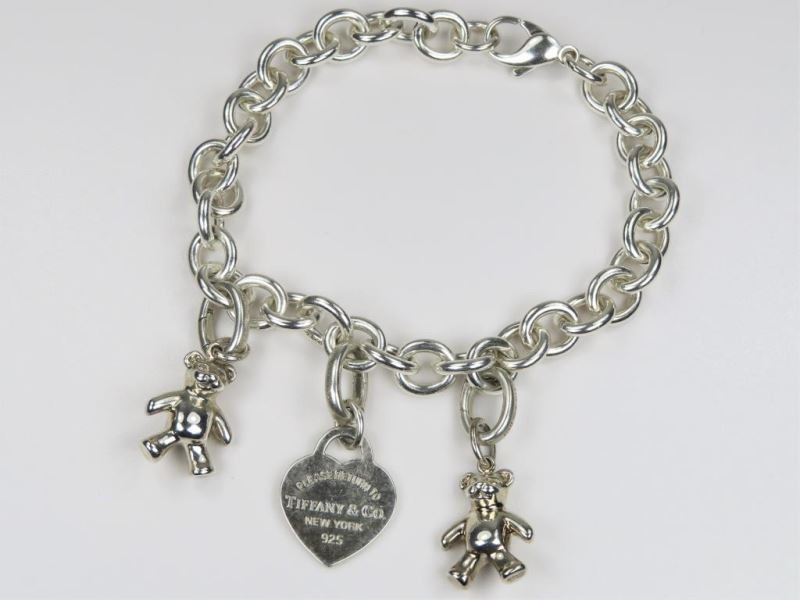 Charm Bracelet featuring 3 Hallmarked ‘TIFFANY and Co.’ charms 2 Teddy Bears and 1 Heart Shaped Tag. MINT Condition with original Tiffany Co. Bag.