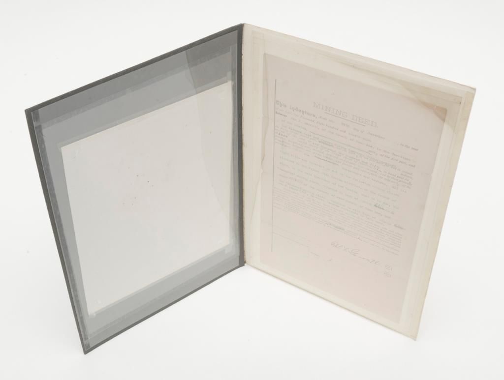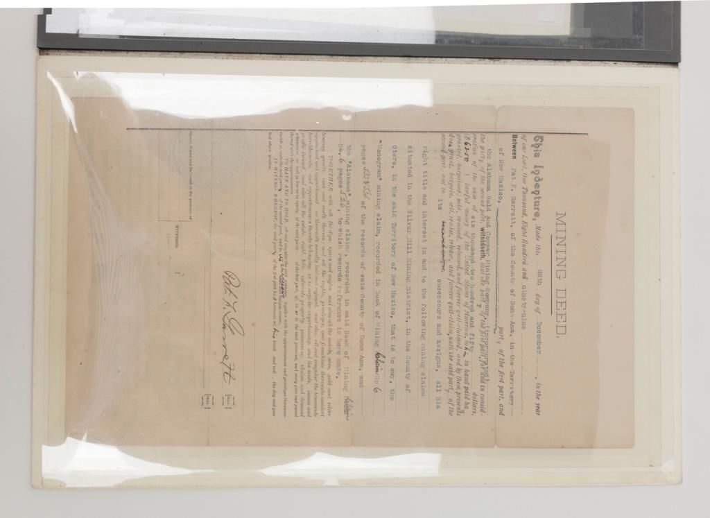 Authentic Territory of New Mexico Mining Deed dated December 28, 1899, and hand-signed in ink, twice, by legendary Western lawman, Pat Garrett, releasing his interest in the “Monogram” mining claim, located in the Silver Hill Mining Districtof Otero County, NM Territory, for the sum of $6,250.00, with affixed gold notary seal and hand-signed in ink “Edward C. Wade”, Notary Public. The document itself is in overall very good + condition and is contained in a hard foliowith clear interior protective cover leaf. The front of the folio has a “window” displaying a photocopy of one of the more popular pictures of Garrett in a three-piece suit and bowler hat. In addition to his work in law enforcement, Patspeculated continually in real estate, mining and ranching interests which created wide swings in his financial situation throughout most of his life. His killing of Billy the Kid was not only controversial during his life, but remains anoften heatedly discussed topic still to this day as does the subject of who really killed him in 1908 and for what reason. A rare piece of early Western Americana worthy of inclusion in any serious public or private collection. Est.: