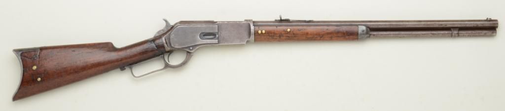 Authentic Winchester Model 1876 Indian-tacked lever action SRC with period replaced 23” octagon rifle barrel, .45-75 cal., blue finish, wood stocks, #44363. This gun is in overall good to very good condition showingclassic wear and old brass tacking, some missing with just the pins remaining; brown patina mixed with some muted plum finish, good markings and bore, action is crisp, dustcover removed; stocks are worn with oldmars, scratches and some losses; old repair to the wrist; accompanied by a factory letter indicating this carbine was shipped from the Winchester warehouse on April 8, 1885 to the North West Mounted Police; also included are additional research records on the NWMP-shipped Model 1876s including the summary by Cody Firearms Museum Research Volunteer John M. Hawk, which further verifies this serial number among thoseshipped to the Mounties. A great looking gun that likely would have a great story if it could talk! Est.: $4,000-$6,000.