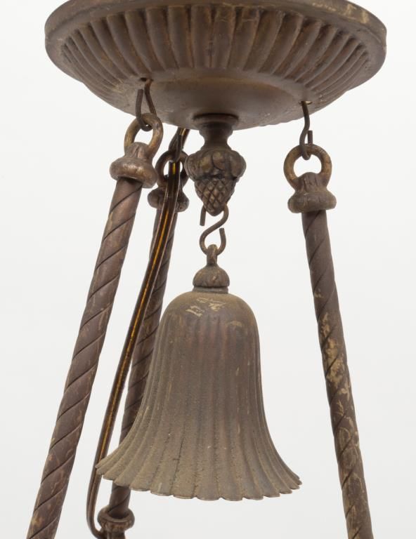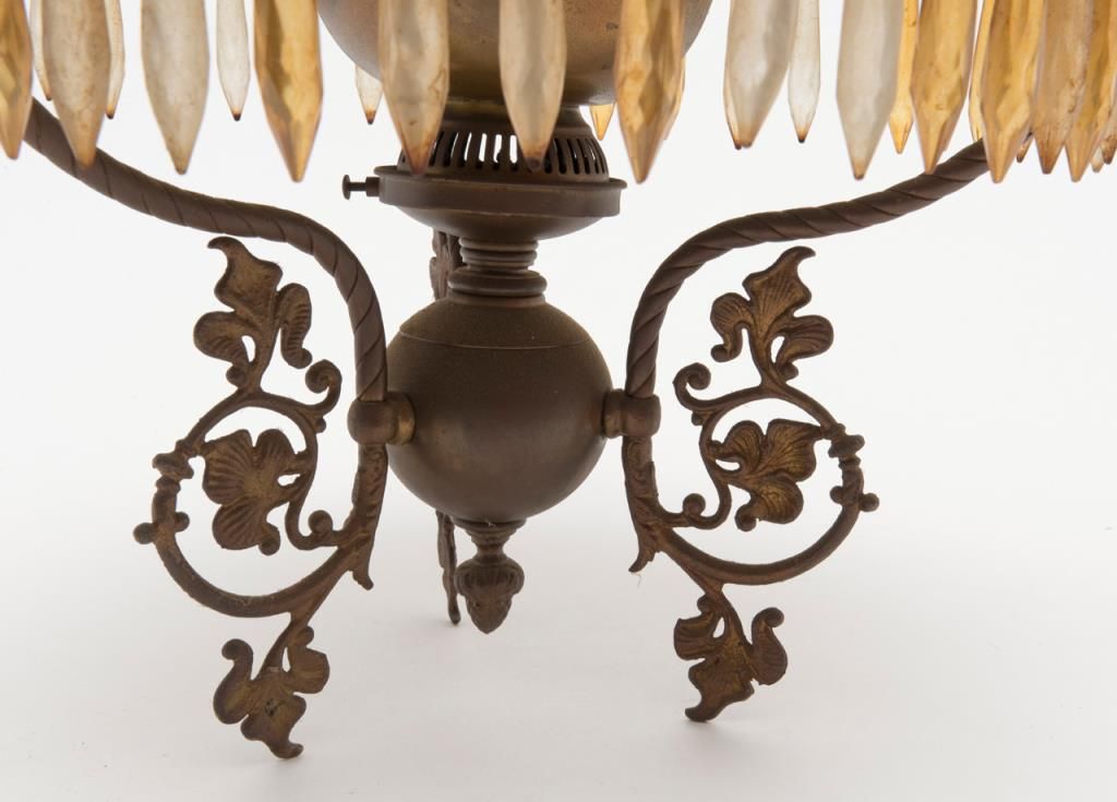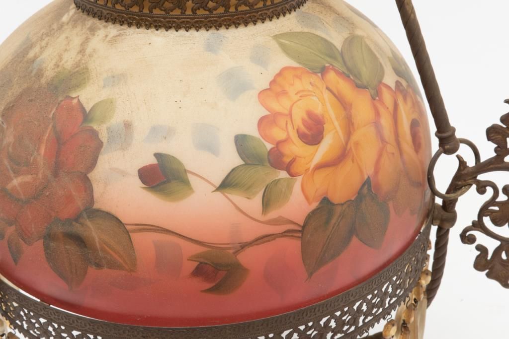 Authentic antique parlor type hanging lamp converted from kerosene to old electricity with fancy brass mounts and shade painted with roses. The lamp is very dirty as is the shade from storage but complete and would clean and restorenicely. Do not use before rewiring. Est.: $175-$350