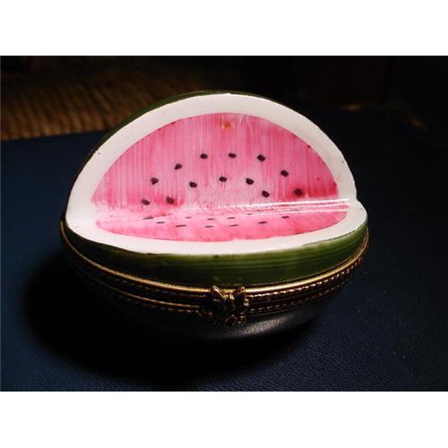 Here is a "Watermelon" hand-painted Porcelain box. Excellent condition, hinges and clasps work fine.