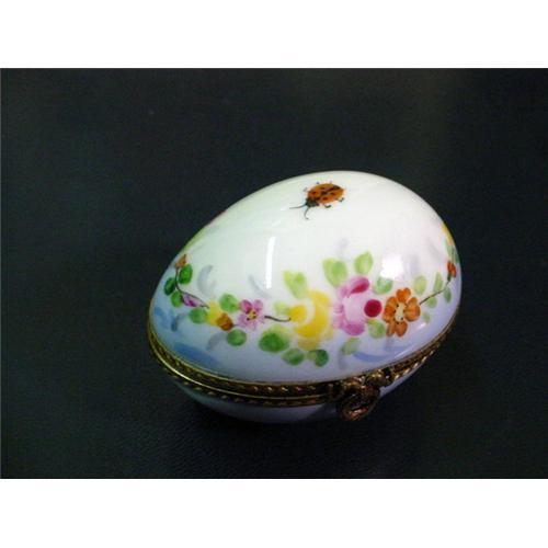 Here is a SUPERB "Egg with Lady Bug" hand-painted Porcelain box. Excellent condition, hinges and clasps work fine.