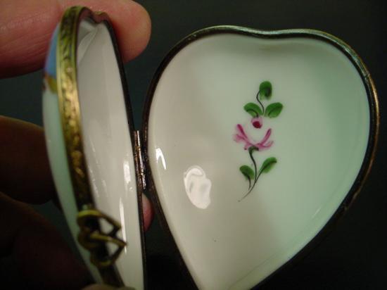 Authentic hand-painted Limoges box signed by artist from a famous studio! This box was created by an artist, graduate of one of the most prestigious French Fine Porcelain schools. Here is a SUPERB "Heart" hand-painted Porcelain box. Excellent condition, hinges and clasps work fine. This Limoges box is marked "Peint main" (Hand-painted) Limoges France, signed: A-A + #50 for the 50th from a very limited production...as shown in picture. It is in mint condition (No chips, cracks or repairs). Would be a great value to any Limoges box collection. For the shipping...don't worry, we ship from Texas (not from France)! h-0.75/ w-3/ d-2.5