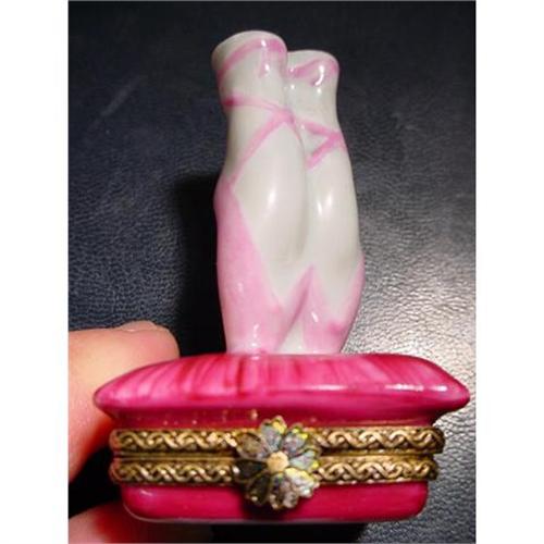 Here is a "ballerina pump" hand-painted Porcelain box. Excellent condition, hinges and clasps work fine.