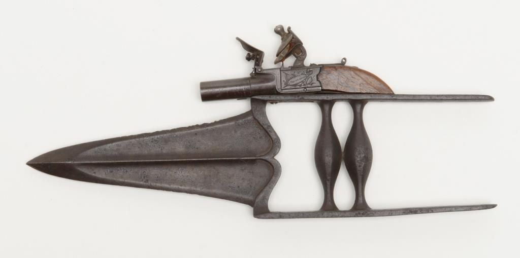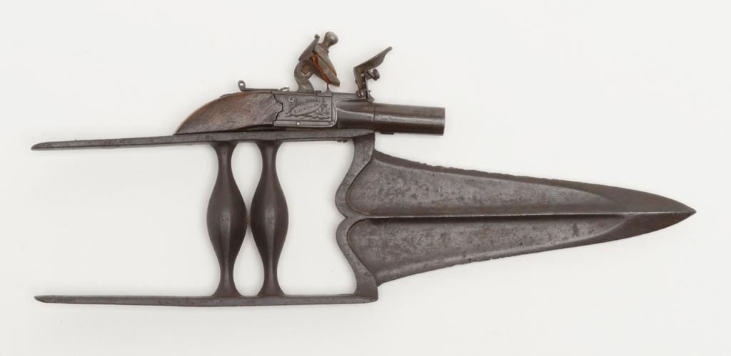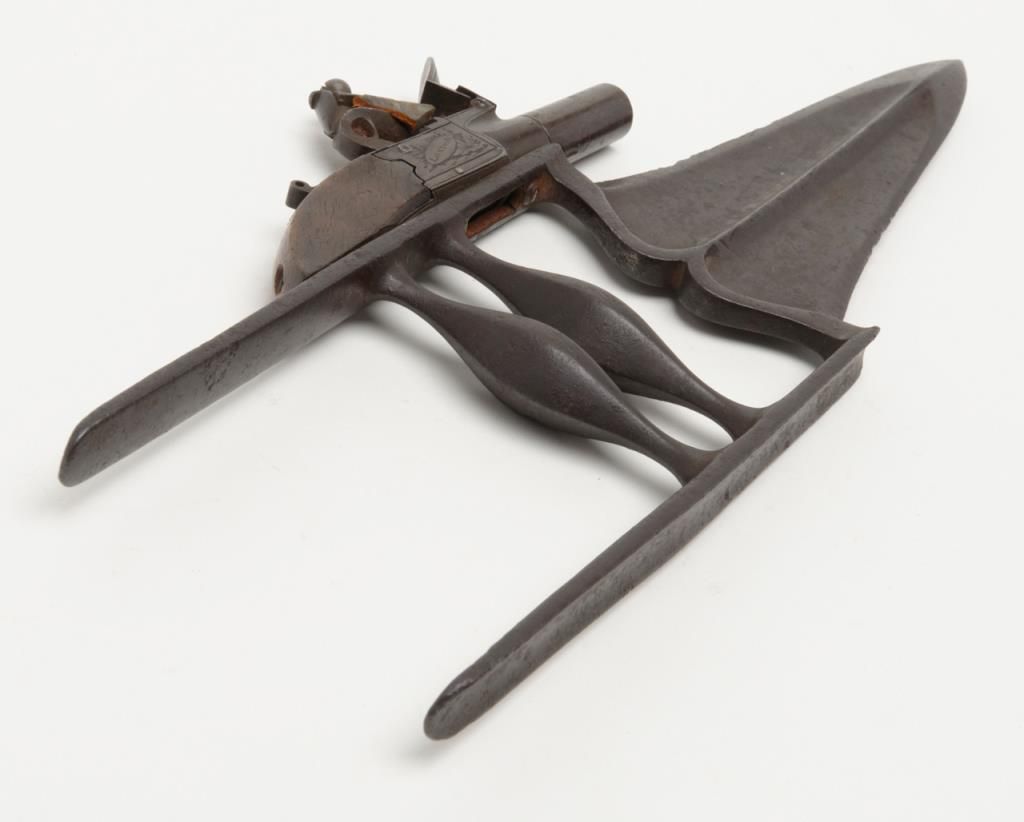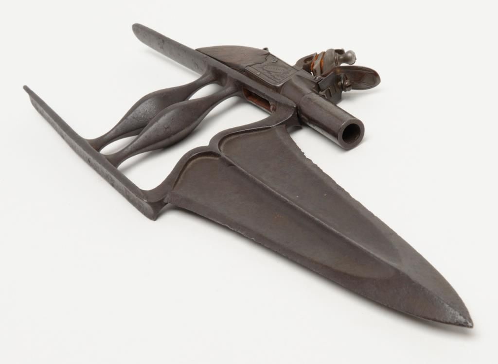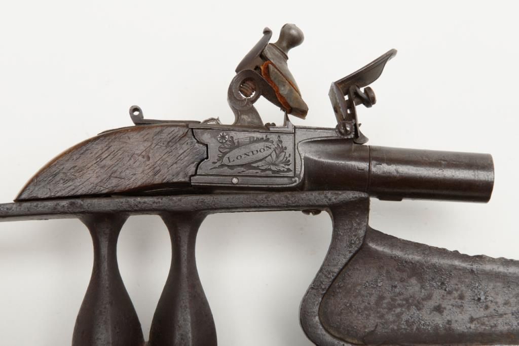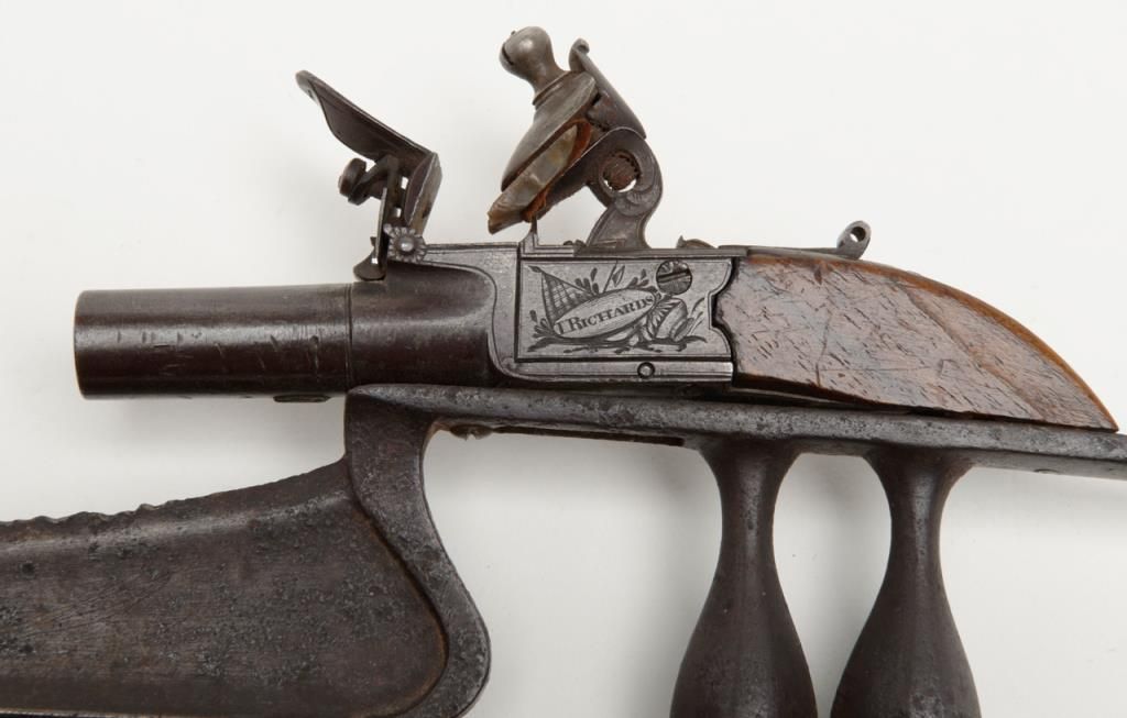 Authentic oddity flintlock pistol mounted on armor piercing dagger from 19th century India in overall very good condition showing an un-cleaned dark patina, some scattered spots of erosion on the blade of the dagger; flintlock is marked “I.Richards” and “London”, .36 cal., 1-1/2” round barrel, good action, folding trigger, good wood; quite a weapon for its time! (Antique). Est.: $500-$1,000