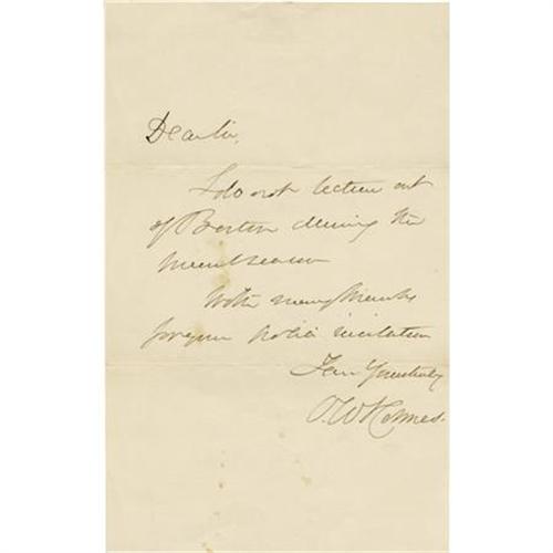 <B>Author Oliver Wendell Holmes, Sr. Autograph Letter Signed</B></I> “<I>O. W. Holmes</B></I>”. One page, 4.5” x 7.25”, Boston, December 19, 1868 , to N. W. Beldev, Paterson, New Jersey, with the original transmittal envelope. In this brief note Holmes declines an offer to speak writing in part: <I>I do not lecture out of Boston during the indiscernible season</B></I>”. With the usual fold creases, lightly soiled, else near fine. <BR><BR><b>Shipping:</b> Flat Material, Small (<a target="_blank" href="http://www.heritageauctions.com/common/shipping.php">view shipping information</a>)