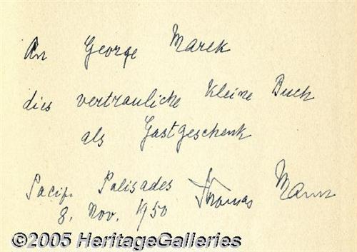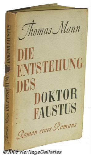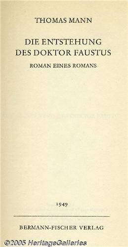<B>Author Thomas Mann First Edition Inscribed and Signed in 1950</B></I> <I>Die Entstehung des Doktor Faustus: Roman Eines Romans</B></I> (Bermann-Fischer, 1949), 7 3/4" x 5", 204 pages. First Edition. Original flexible cloth boards and dust jacket. Inscribed and signed by the author on the front fly leaf. Two or three minor spots or stains, top corners a bit creased through second half of book, otherwise a nearly fine copy in a good jacket (spine paper darkened and with small losses slightly affecting titling). Despite the subtitle here, this is not a novel, but, instead, a discursive autobiographical essay, written during the creation of the work referred to in the title. Specifically, it covers the period of Mann's creative work from January of 1943 to the appearance of the famous "Doktor Faustus" in 1947. The inscription here reads (in German): "To George Marek/ this intimate little book/ as a 'guest-gift'/ Pacific Palisades/ 8 Nov. 1950/ Thomas Mann." <I>PSA/DNA lacks sufficient comparable examples to render an opinion on this item. While we believe it to be authentic as described, it is thus sold without certification.</B></I>