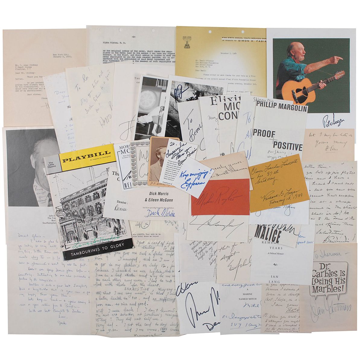 Collection of over 100 items, including signatures, book pages, FDCs, letters, and photos signed by authors and illustrators from all fields. Signers include: F. E. Abbott, Rod Arkell, Peter Arno, Henry Ward Beecher, Lyman Beecher, Nathaniel Benchley, Peter Benchley, Gary Braver, Heywood Brown, Mike Brzezinski, Thornton W. Burgess, Philip Caputo, Lee Carl, Carl Carmer, Jimmy Carter, G. W. Casle, Neil Cavuto, Michael Connely, Douglas Cooper, William Diehl, Denise Dietz, Florence Dietz, Jean Dixon, Allen Drury, Havelock Ellis, Suzanne Farrell, R. DeVoll Fisher, Fannie Flagg, Rebecca Flowers, Richard Ford, Vicente Fox, Alan Furst, John Gertner, W. Wilson Goode, W. E. B. Griffin, Lewis Grizzard (2), Terry Gross, Dan Gutman, Langston Hughes, Thomas Hughes, Clarence Jones and Kumeta Gordon, Sheldon Judson, John Katzenbach, Ted Key, Tracy Kidder, John Knowles, Dean Koontz, Lily Koppel, Jayne Anne Kreutz, Ian Lang, John le Carre, Dennis Lehane, Richard Luger (2), Thomas J. Madden, Stanley Marcus, Phillip Margolin, Yvonne Mason, Terry McMillan, Brad Meltzer, Zell Miller, Dick Morris, Greg Mortenson, A. Edward Newton, Louis Nizer, Darden North, Mitch Page, Robert B. Parker, Drew Pearson, Sara Peretsky, Wendell Phillips, Martha Powers, Richard Preston, Leah Rabin, Perry T. Rathbone, Condoleezza Rice, David William Ross, Mike Royco, Pierre Salinger, Ed Schultz, Norman Schwarzkopf, June Scobee Rogers, Augusta Seaman, Pete Seeger, Carl Solomon, Robert K. Tanenbaum, Lisa Unger, Susan Vreeland, William Westmoreland, George Will, Stuart Woods, and Elmo Zumwalt. In overall fine condition, with various folds, toning, and creases.