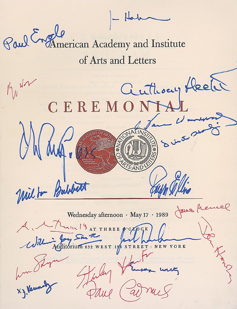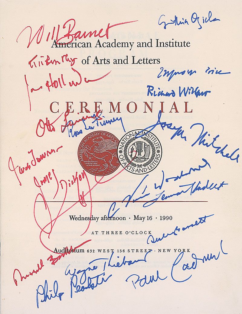 Pair of programs for 1989 and 1990 American Academy and Institute of Arts and Letters ceremonies, 8.5 x 11, each signed on the front cover in blue and red felt tip by a multitude of authors. Signers of the 1989 program include Paul Engle, Paul Cadmus, Milton Babbitt, William Styron, Ralph Ellison, Eudora Welty, X. J. Kennedy, C. Vann Woodward, John Hollander, Anthony Hecht, and Stanley Kunitz. Signers of the 1990 program include Will Barnet, Eric Bentley, John Hollander, Reynolds Price, Richard Wilbur, Otto Luening, Ross Lee Finney, Joseph Mitchell, Jacob Lawrence, James Dickey, C. Vann Woodward, Lennart Anderson, Russell Banks, Leslie Bassett, Wayne Thiebaud, Cynthia Ozick, Philip Pearlstein, and Paul Cadmus. In overall fine condition.
