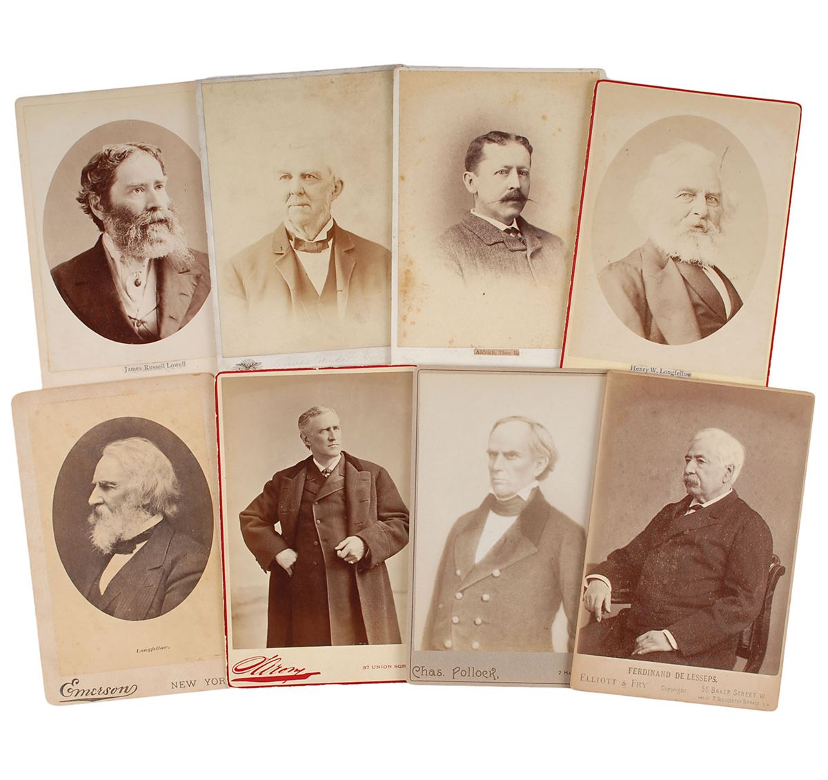 Collection of seven unsigned cabinet photos of authors and a handful of other notable figures, all measuring the standard 4.25 x 6.5, including: James Russell Lowell, Oliver Wendell Holmes, Thomas Bailey Aldrich, Henry Wadsworth Longfellow (2), Thomas F. Bayard, Daniel Webster, and Ferdinand de Lesseps. Foxing to the Aldrich image and general wear, otherwise overall fine condition.