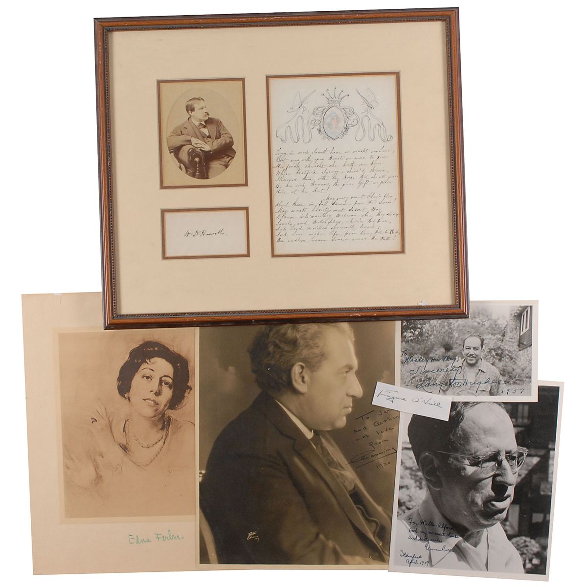 Excellent collection of six items, each signed by a distinguished author or playwright, including: William Dean Howells (signature and unsigned handwritten poem), Eugene O’Neill (signature), Elmer Rice (SP), Langston Hughes (SP), Edna Ferber (portrait print), and Channing Pollock (SP). In overall fine condition. Individual descriptions are as follows: