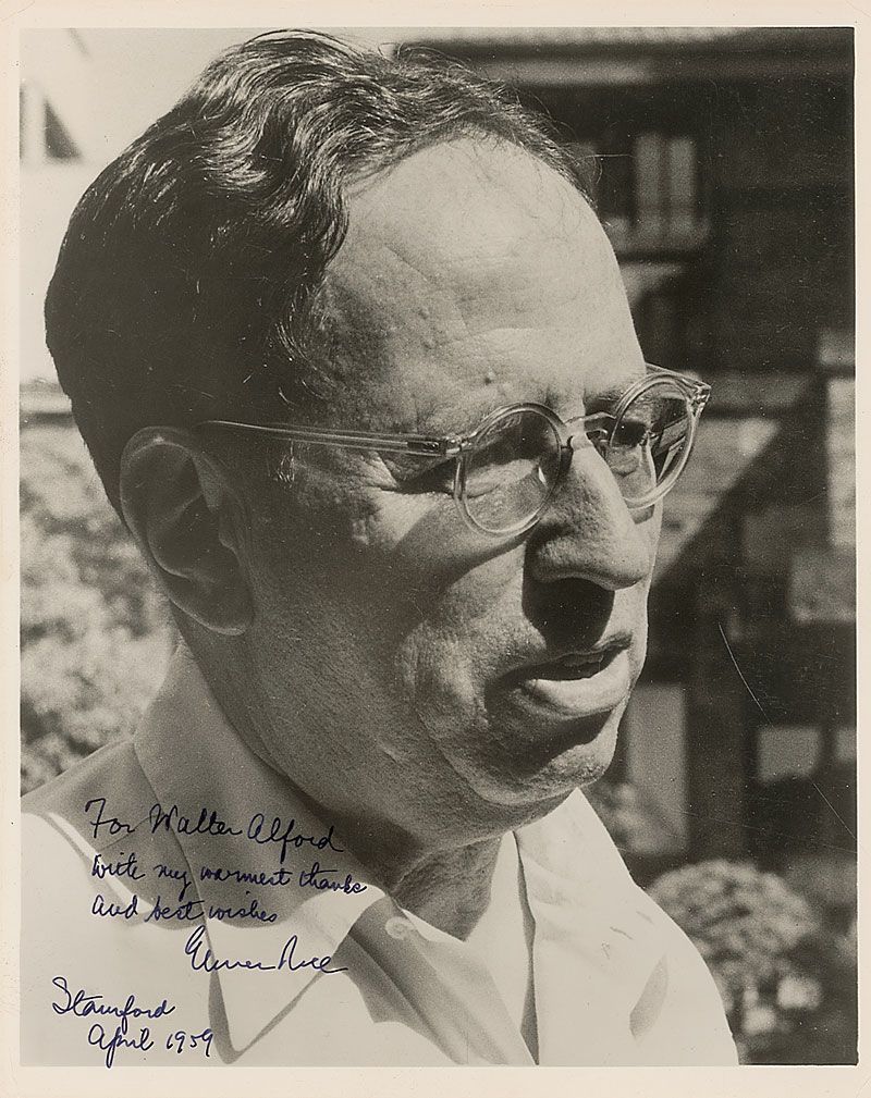Elmer Rice: Vintage glossy 8 x 10 head-and-shoulders photo of Rice, signed and inscribed in fountain pen, “For Walter Alford, with my warmest thanks and best wishes, Elmer Rice, Stanford, April 1959.” In fine condition, with trivial corner tip creases.