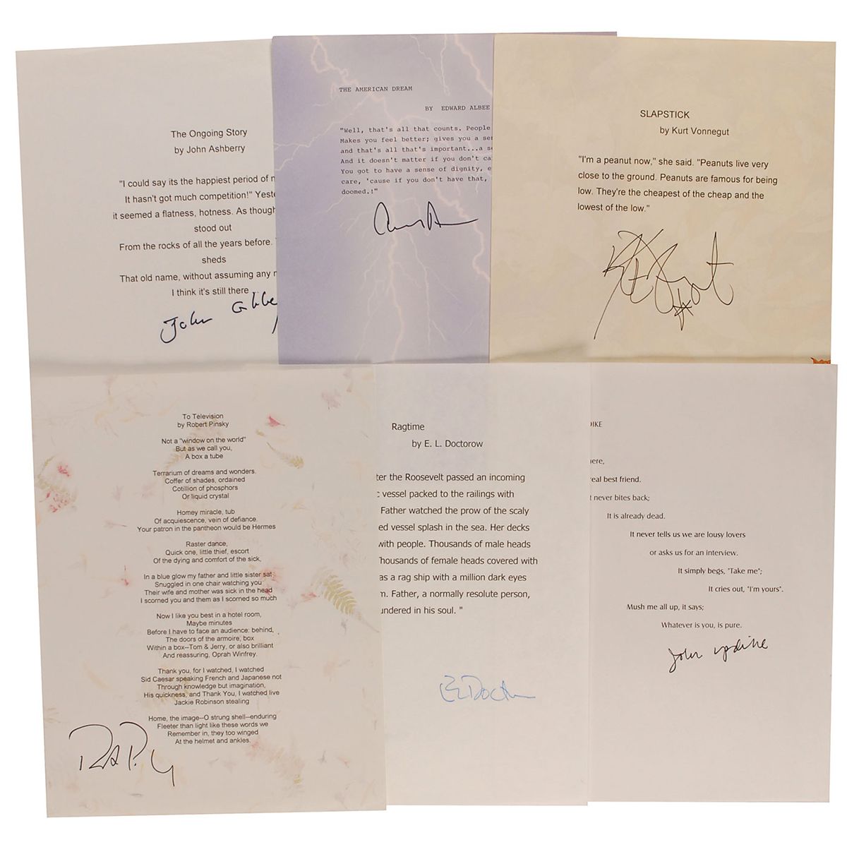 Six souvenir typescripts, each 8.5 x 11, each signed at the conclusion in blue or black felt tip by its author. Included are excerpts from Slapstick by Kurt Vonnegut, ‘Food’ by John Updike, Ragtime by E. L. Doctorow, ‘The American Dream’ by Edward Albee,