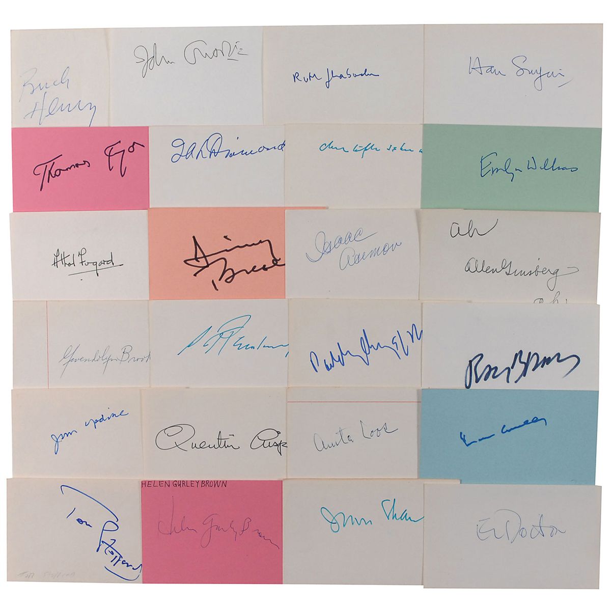 Twenty-four ink signatures on individual 5 x 3 cards of various colors, each signed by a different author. Signers include: Allen Ginsberg, Isaac Asimov, John Updike, Ray Bradbury, E. L. Doctorow, Anita Loos, Quentin Crisp, Irvin Shaw, Helen Gurley Brown, Tom Stoppard, Marc Connelly, Paddy Chayefsky, Buck Henry, S. J. Perelman, Gwendolyn Brooks, Jimmy Breslin, Athol Fugard, Emlyn Williams, Christopher Isherwood, I. A. L. Diamond, and Tom Tryon. In overall fine condition.