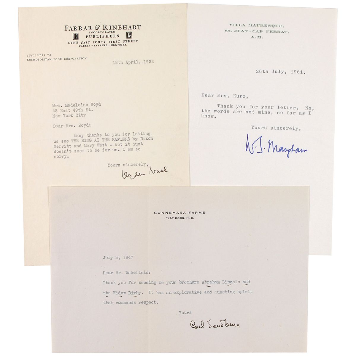 Three brief TLSs, each one page, dated between 1932 and 1961. Signers are: W. Somerset Maugham, Carl Sandburg, and Ogden Nash. In overall fine condition. Accompanied by the original mailing envelope for the Sandburg letter.