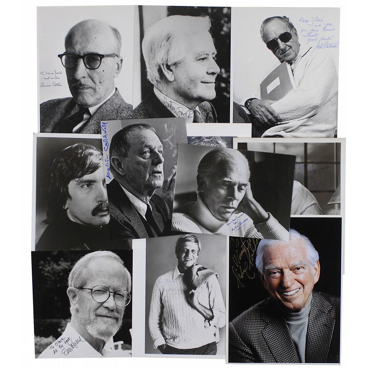 Eleven photos of various finishes, ranging in size from 6.5 x 8.5 to 8.5 x 11, each signed in ink by the author pictured, many inscribed. Signers are: Edward Albee, Robert Anderson, Erskine Caldwell, Bruce Canton, John Dufresne, Horton Foote, Elmore Leonard, John Patrick, George Plimpton, Sidney Sheldon, and Mickey Spillane. In overall fine condition.