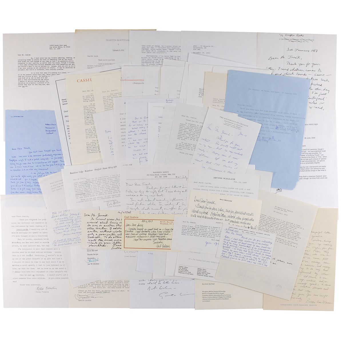 Collection of 59 letters from various authors, most with interesting content commenting on their influences, consisting of both ALSs and TLSs. ALSs are from George Mackay Brown, John Casey, Maureen Duffy, Lawrence Durrell, Walter S. Edmunds, Christopher Fry, Rumer Godden, Gail Godwin, Robin Jenkins, Bobbie Ann Mason, Stanley Middleton, Sue Miller, James Purdy, Alan Sillitoe, James Stern, Richard Stern, William Styron, and Graham Swift. TLSs are from Beryl Bainbridge, John Bainville, Stan Barstow, Nina Bawden, Stephen Becker, Martin Booth, Melvyn Bragg, David Brin, Anita Brookner, Niven Busch, A. S. Byatt, Martin Caidin, R. V. Cassill, David Caute, Alan Cheuse, Isabel Colegate, Evan Connell, Lionel Davidson, Peter Dickinson, Dorothy Dunnett, William Eastlake, Stanley Elkin, Timothy Findley, Celia Fremlin, David Gerrold, Brian Glanville, A. B. Guthrie, Joe W. Haldeman, Mark Harris, Mervyn Jones, William P. Kinsella, David Lodge, Gavin Lyall, Nicholas Mosley, Anthony Powell, Carol Shields, Elizabeth Spencer, Wallace Stegner, John Updike, Irving Wallace, and Jon Manchip White. Stegner’s letter, in part: “I confess I find some contemporary fiction obsessed with both sensation and sex, and wouldn’t want to try to imitate it…When I’m working on a novel, submerging myself in it for several hours a day, seven days a week, I don’t like to read any fiction at all.” Durrell’s letter, in full: “You only have to think of Freud and Charcot or of Proust and Ruskin or of Shakespeare and Marlowe.” In overall fine condition.