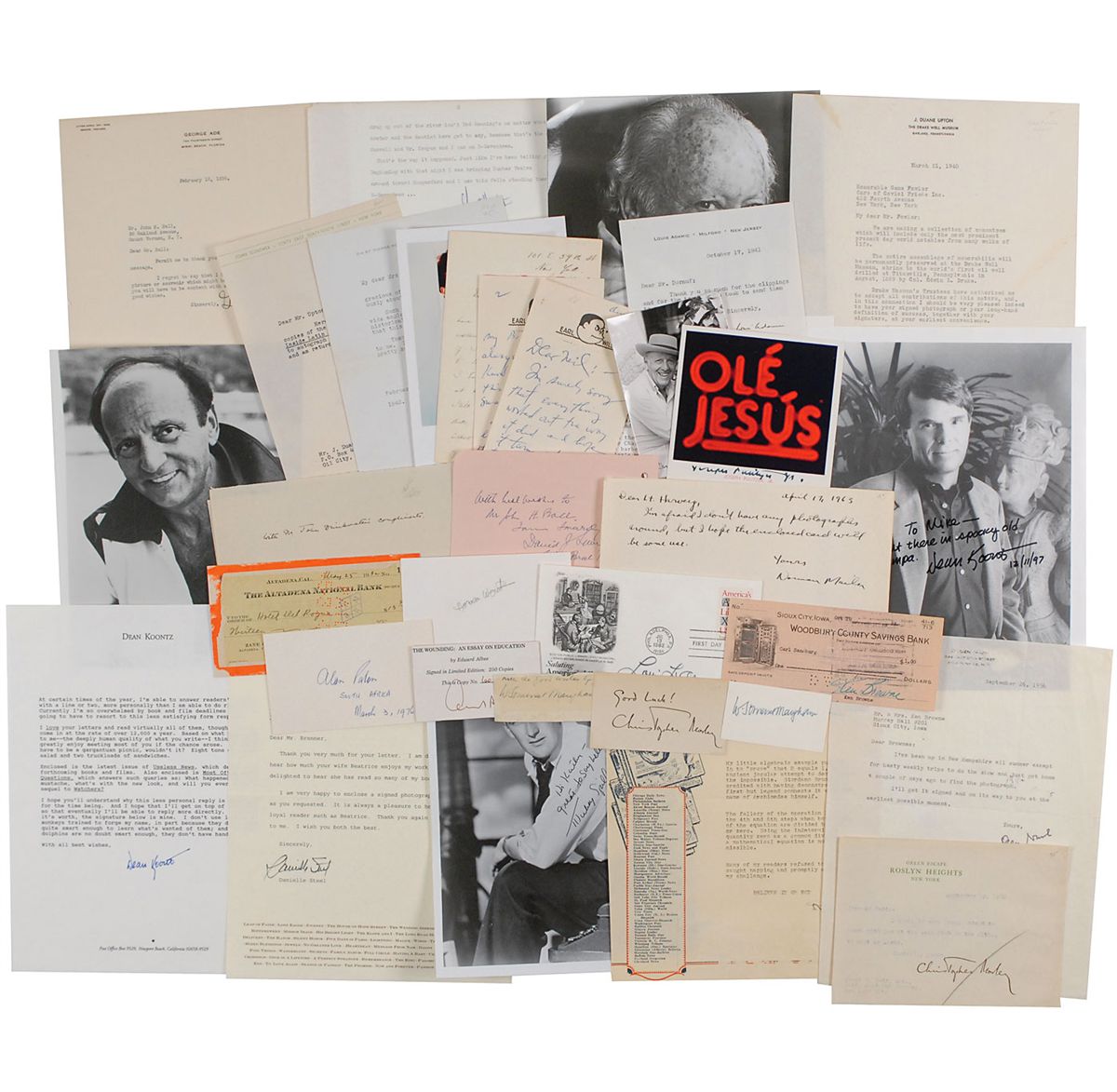 Collection of 34 items consisting of a great variety of formats, including letters, photos, signatures, and checks, each signed by an author. Signers are: Louis Adamic, George Ade, Edward Albee, Frederic Dannay, August Derleth, Lloyd C. Douglas, John Drinkwater, Zane Grey, John Gunther, Dean Koontz (2), Louis L’Amour, David J. Lewis, Norman Mailer, W. Somerset Maugham (2), Christopher Morley (2), Ogden Nash, Alan Paton, Joseph Pulitzer, Jr., Robert Ripley, Harold Robbins (2), Carl Sandburg, Mickey Spillane, Harriet Elizabeth Prescott Spofford, Danielle Steel (2), J. Duane Upton, Leon Uris, Earl Wilson, and Herman Wouk (2). In overall fine condition.