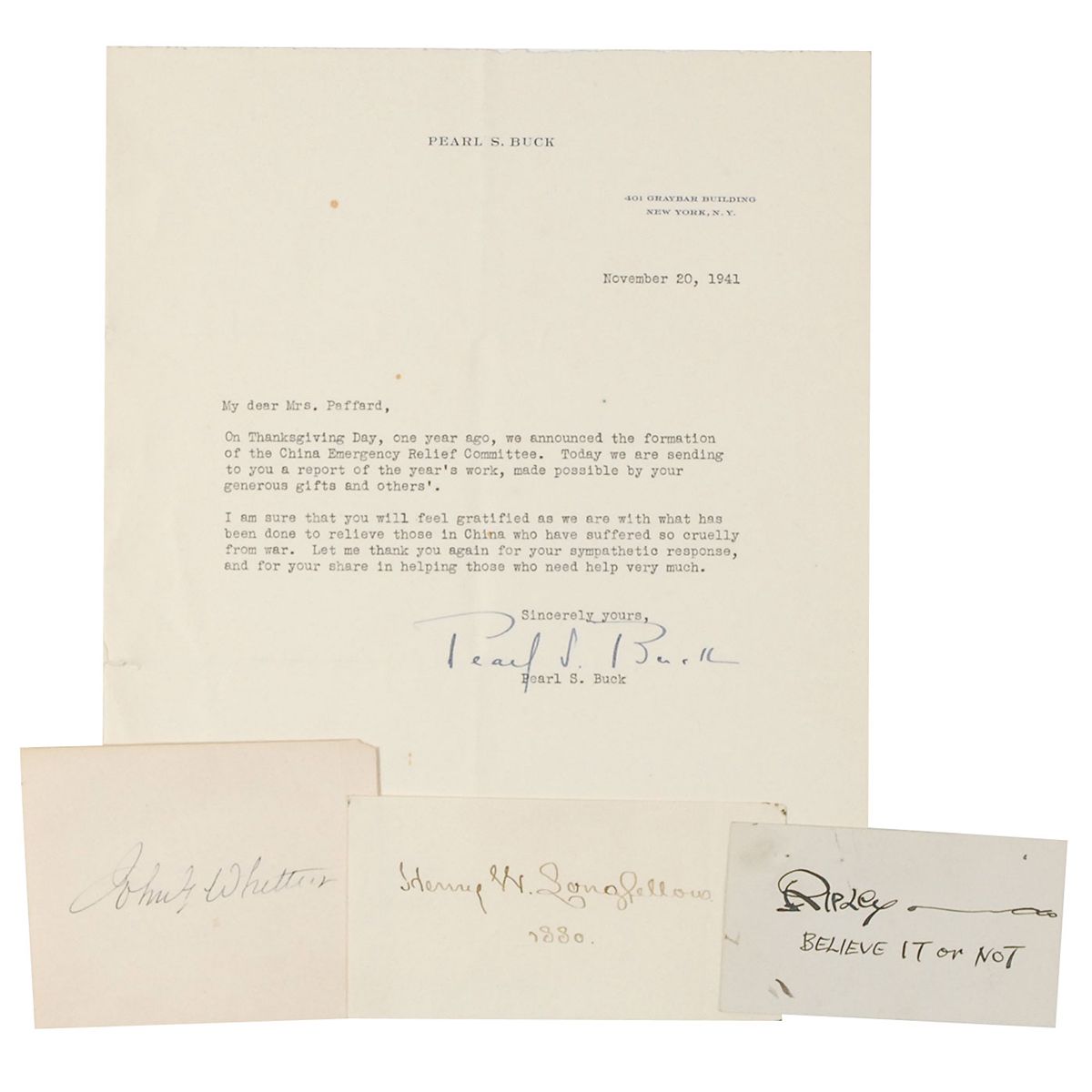Collection of four items, each signed by a prominent American author, including: Henry W. Longfellow (signature), John Greenleaf Whittier (signature), Robert Ripley (signature), and Pearl S. Buck (TLS). In overall fine condition, with various light soiling.