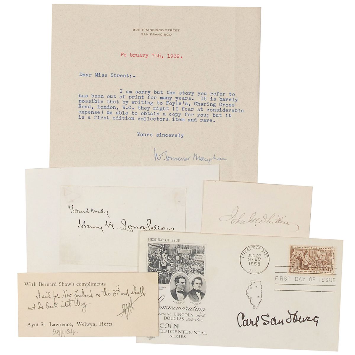 Collection of five items, each signed by an acclaimed writer, including: Henry W. Longfellow (signature), W. Somerset Maugham (TLS), John Greenleaf Whittier (signature), George Bernard Shaw (ANS, signed with his initials only), and Carl Sandburg (FDC). In overall fine condition.