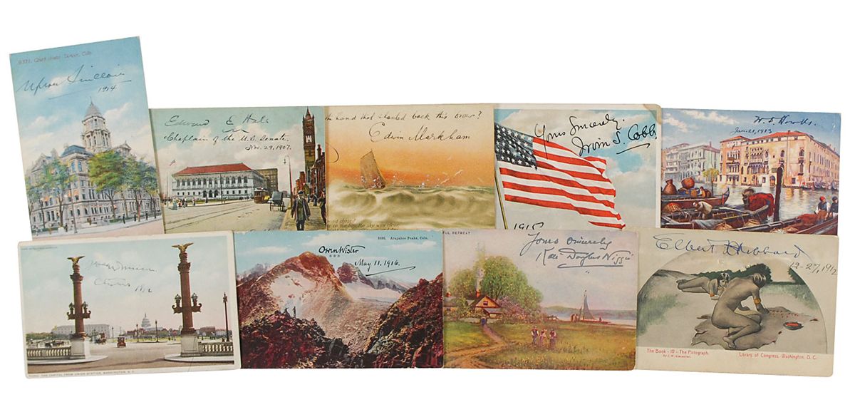 Intriguing collection of nine color postcards, 3.5 x 5.5 and 5.5 x 3.5, each boldly signed by a prominent early 20th century American author, including: Upton Sinclair, Edward Everett Hale, Elbert Hubbard, Edwin Markham, William Dean Howells, Kate Douglas Wiggin, Owen Wister, Joaquin Miller, and Irvin Cobb. Scattered creases and corner tip dings, otherwise overall fine condition.