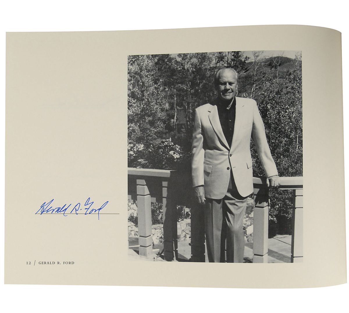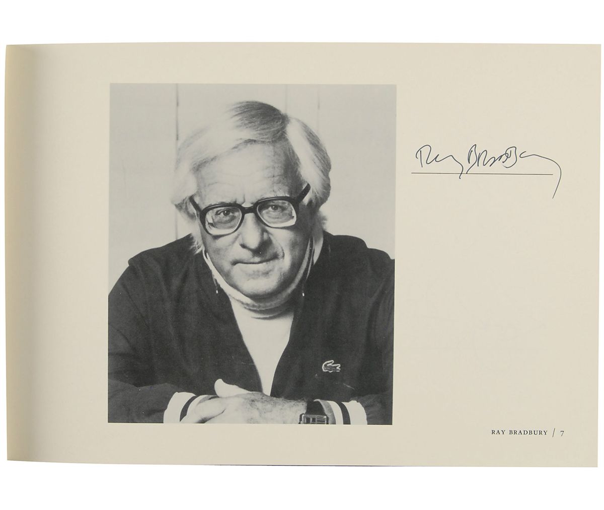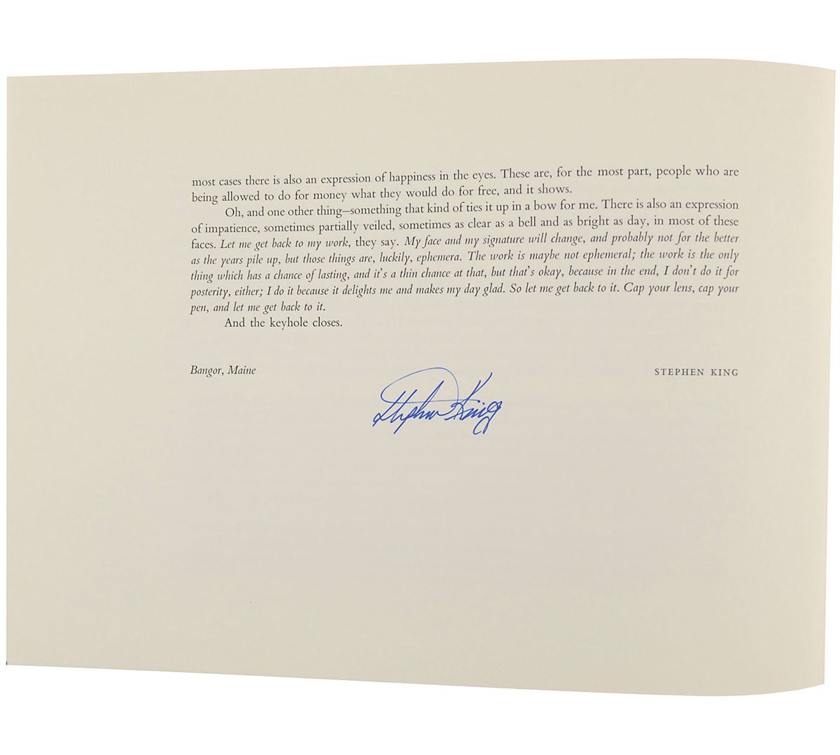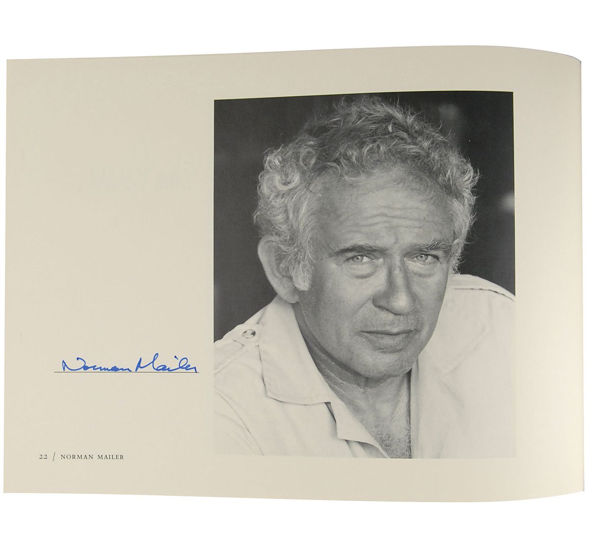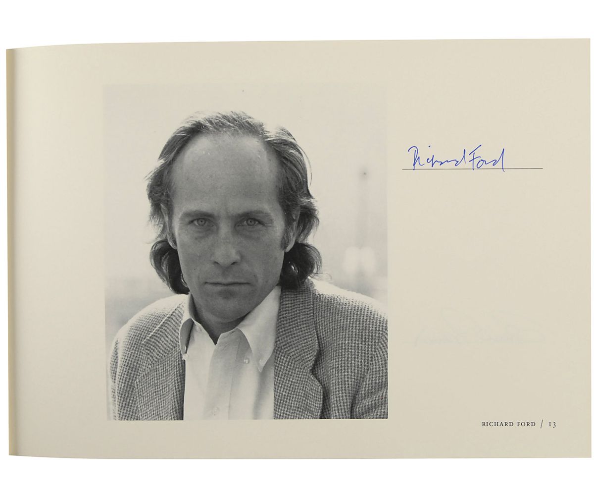 Signed book: Lord John Signatures. Pre-production 'presentation' edition. Northridge, CA: Lord John Press, 1991. Hardcover, 11 x 7.5, 75 pages. Signed in ink by 30 writers or notable figures near their images, including: Stephen King, William F. Nolan, John Barth, James Blaylock, Robert Bloch, T. Coraghessan Boyle, Ray Bradbury, Ramsey Campbell, James Crumley, Louise Erdrich and Michael Dorris, Dennis Etchison, Gerald R. Ford, Richard Ford, Bruce Francis, Ellen Gilchrist, Jim Harrison, William Kennedy, Harry Crews, Thomas McGuane, Tony Hillerman, Ursula K. Le Guin, John L’Heureux, Elmore Leonard, Norman Mailer, Eudora Welty, Richard Yates, Donald Westlake, James Lee Burke, and William Everson. In fine condition. An unusual example, as there are several blank pages throughout which, in the final version, featured several additional writers who do not appear here. From the collection of noted publisher and founder of Lord John Press, Herb Yellin.