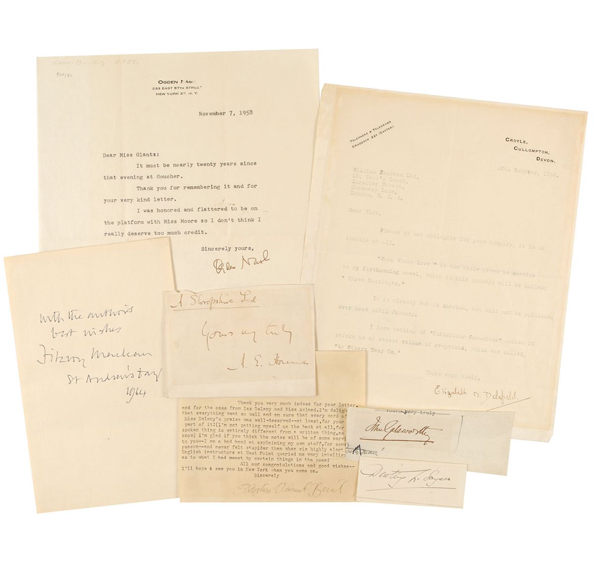 Collection of seven items, each signed by an author, including: Stephen Vincent Benet (TLS), Fitzroy Maclean (signature), A. E. Housman (signature), John Galsworthy (signature), E. M. Delafield (TLS), Dorothy Sayers (signature), and Ogden Nash (TLS). In very good condition, with various scattered creases, toning, and soiling.