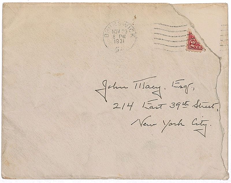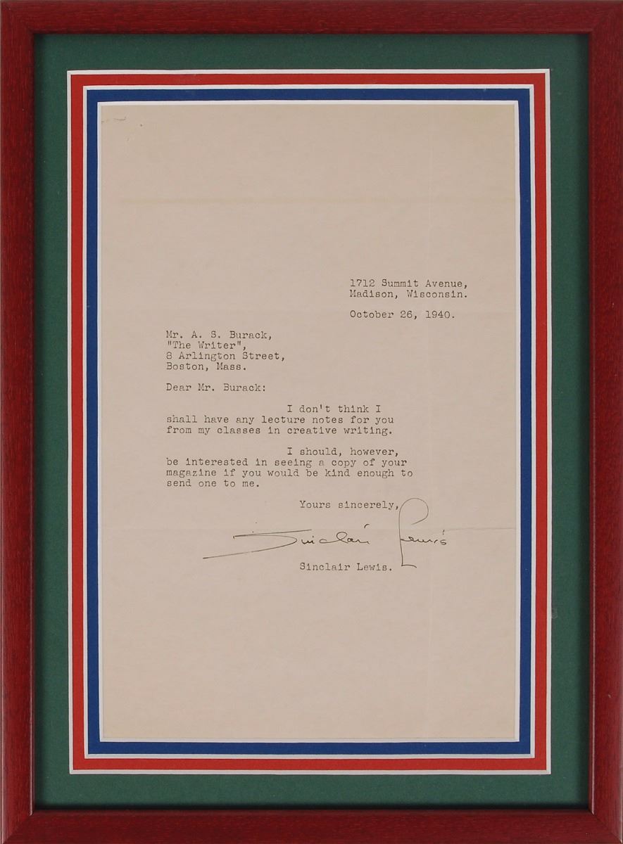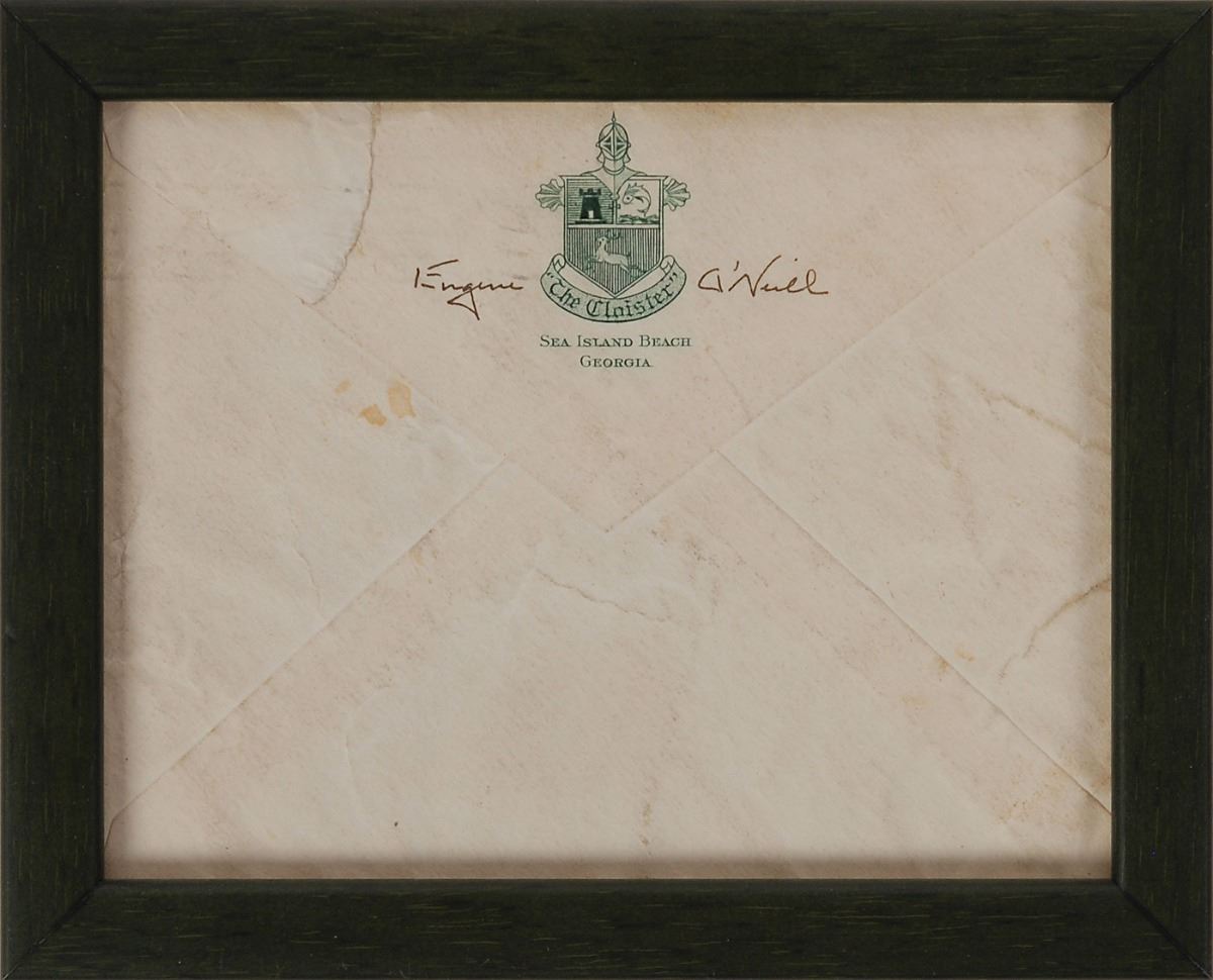 Two items: a TLS by Sinclair Lewis, one page, 7 x 10.5, October 26, 1940, to Mr. A. S. Burack of The Writer, in full: “I don’t think I shall have any lecture notes for you from my classes in creative writing. I should, however, be interested in seeing a copy of your magazine if you would be kind enough to send me one”; and a hand-addressed mailing envelope by Eugene O’Neill, 5.5 x 4.25, addressed by O’Neill to “John Macy, Esq., 214 East 39th Street, New York City,” and signed on the flap, “Eugene O’Neill.” Postmarked Brunswick, Georgia, November 23, 1931. Each is framed and in overall very good to fine condition.