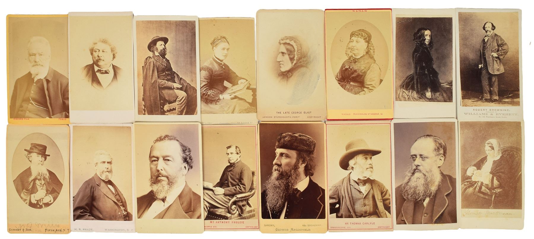 Group of 16 unsigned carte-de-visite portraits of noted 19th-century writers, including: Victor Hugo, Alexandre Dumas, Wilkie Collins, Thomas Carlyle, George MacDonald, James Anthony Froude, Bayard Taylor, John Lothrop Motley, Nathaniel Parker Willis, Alfred Lord Tennyson, Robert Browning, Elizabeth Barrett Browning, George Sand, George Eliot, Jean Ingelow, and Harriet Martineau. In overall fine condition.