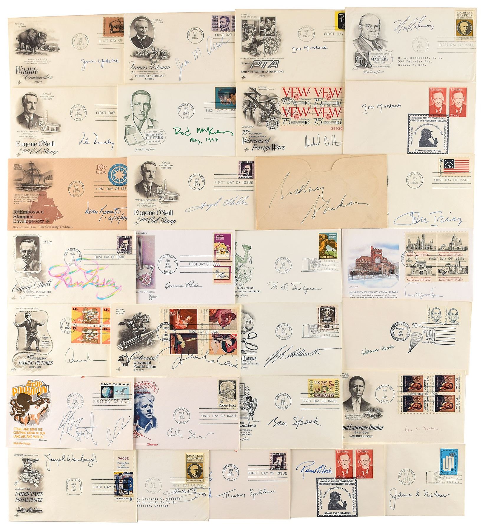 Group lot of 29 commemorative covers signed in ink or felt tip by a notable author, including: Edward Albee, Jean M. Auel, Peter Benchley, Robert Bloch, William F. Buckley, Jr., John le Carré, Michael Crichton, John Kenneth Galbraith, Joseph Heller, John Irving, Ken Kesey, Dean Koontz, Rod McKuen, James A. Michener, Toni Morrison, Iris Murdoch (2), Anne Rice, Sidney Sheldon, Neil Simon, W. D. Snodgrass, Mickey Spillane, Benjamin Spock, Peter Straub, John Updike, Joseph Wambaugh, Tom Wolfe, Herman Wouk, and Kurt Vonnegut and Salman Rushdie. In overall fine condition.