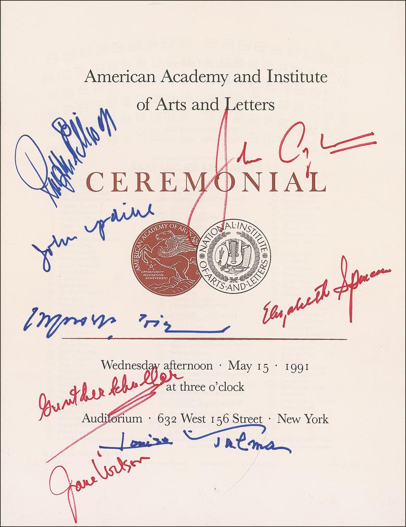 American Academy and Institute of Arts and Letters ceremonial program, 8.5 x 11, signed in red or blue felt tip on the front cover by Ralph Ellison, John Updike, Reynolds Price, Elizabeth Spencer, Gunther Schuller, Louise Talma, Jane Wilson, and John Corigliano. In fine condition.