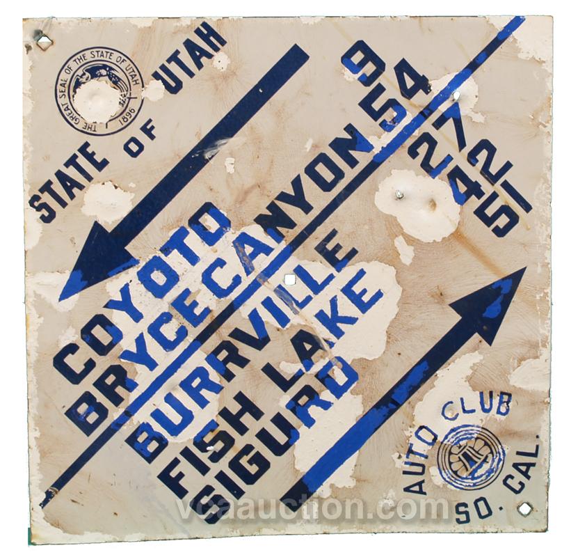 Auto Club So. Cal. Porcelain Street Sign, For The State Of Utah City Miles: Coyoto - 9, Bryce Canyon - 54, Burrville - 27, Fish Lake - 42 & Sigurd - 51, Has Touch-Up - 18" x 18"