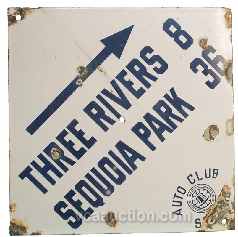 Auto Club So. Cal. Porcelain Street Sign: Three Rivers - 8 & Sequoia Park - 36, - 18" x 18"