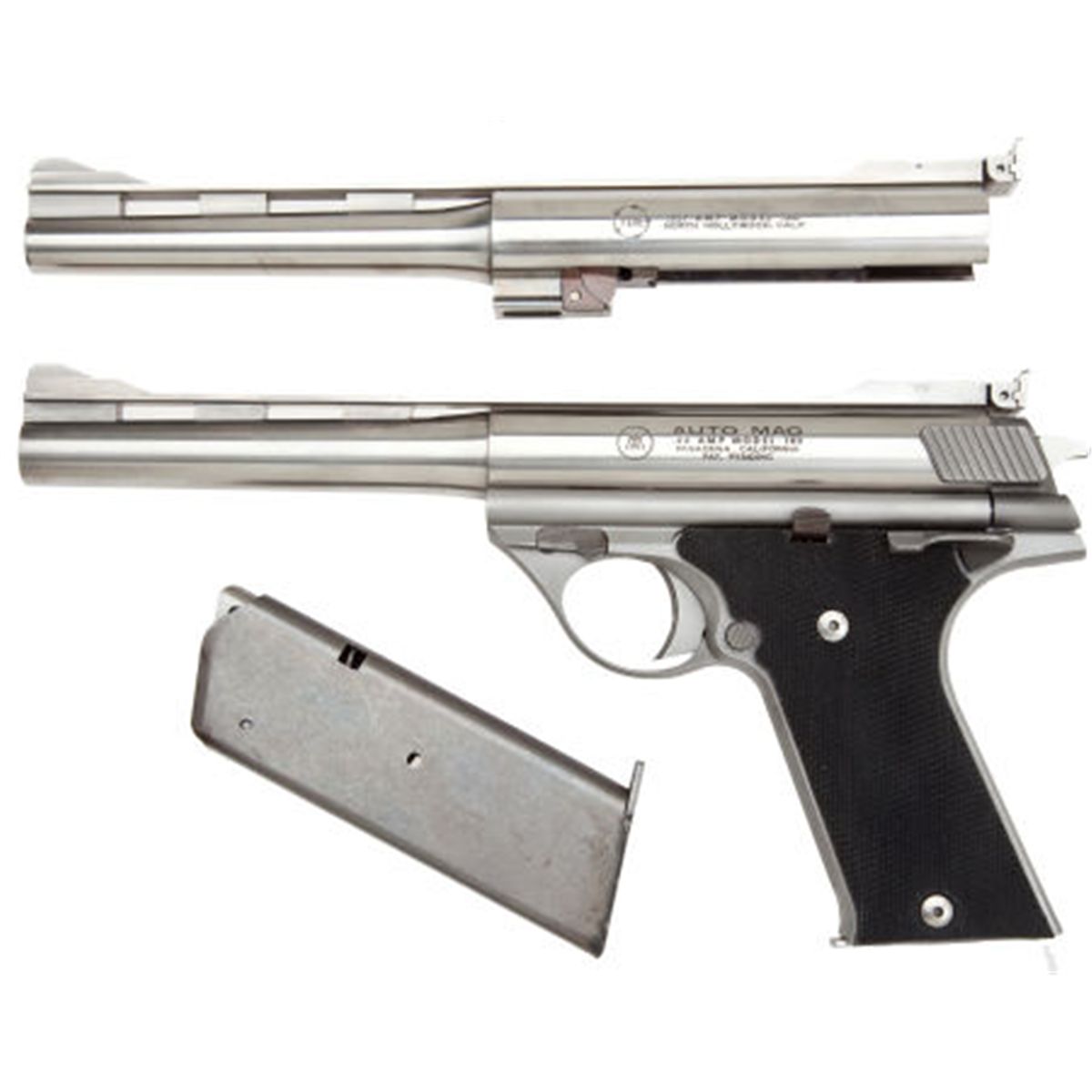 Auto Mag Model 180 Semi-Automatic Pistol. Serial no. A00864, .44AMP caliber. Ventilated rib. Stainless steel construction.Condition: Very good. Minor handling wear.NRA FIREARMS FOR FREEDOM PROGRAM