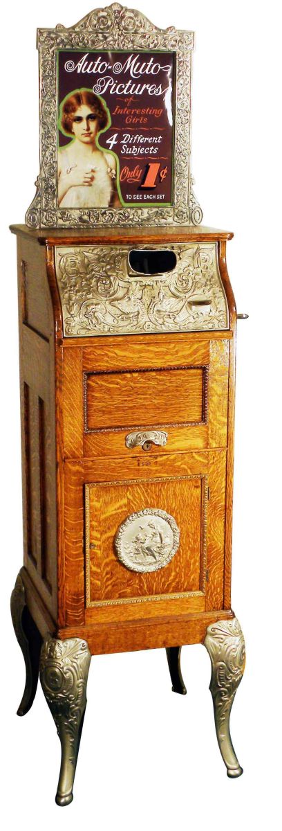 Auto Muto Pictures of Interesting Girls, coin operated. Very good working condition, professionally restored 1993. Comes with key for machine and coin box. 19 X 76 X 19 inches.