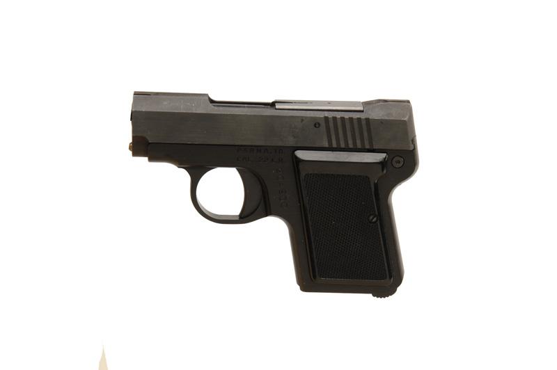 Condition: Perfect with no sign of having been fired. No Magazine.SN:904900, Single action semi-auto pocket pistol. Blued finish, black checkered grips, 2" barrel with fixed sights, good bore and action. Condition: Perfect with no sign of having been fired. No Magazine.