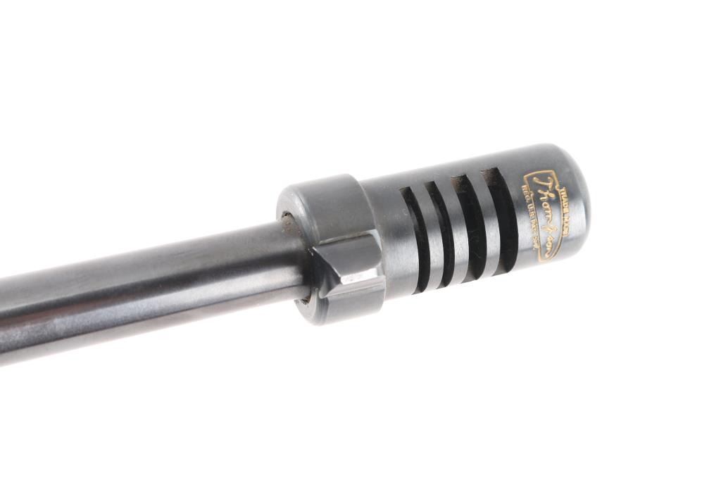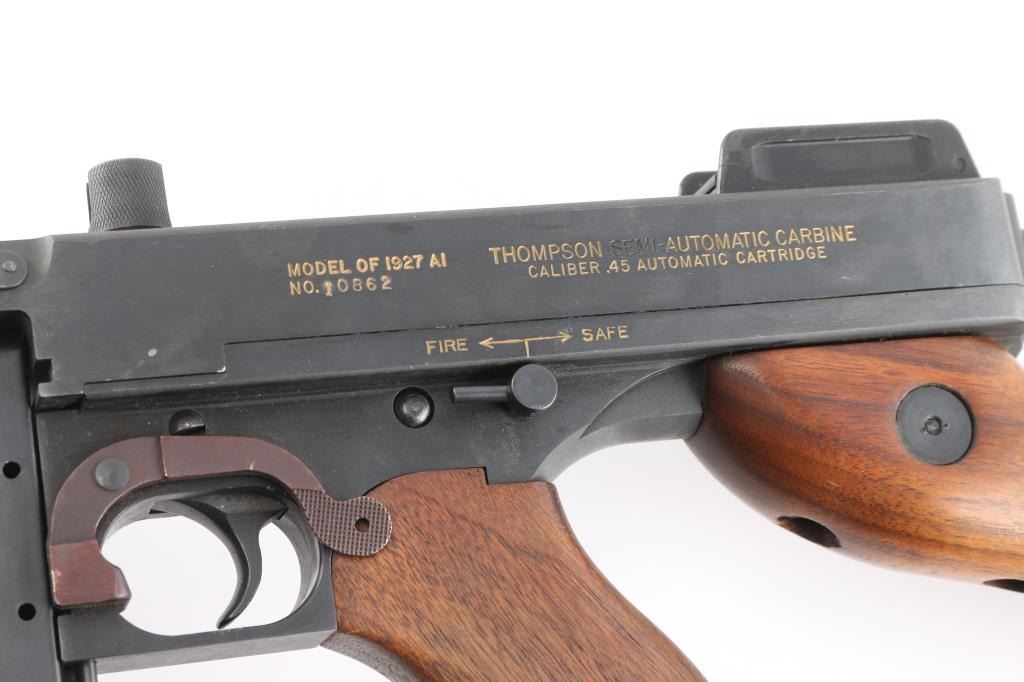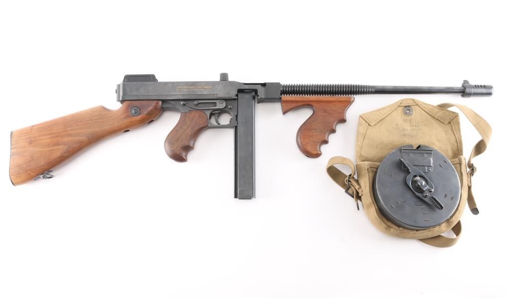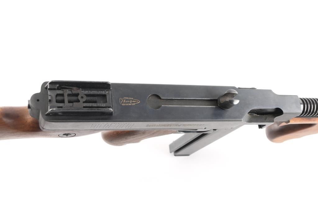 Semi-Automatic version of the Thompson Sub-Machine Gun. The "Chicago Typewriter". 18" finned barrel with pinned Cuts compensator. Blade front and flip ladder, adjustable rear sights. Blued finish with polished American Walnut fixed stock with trapdoor steel buttplate and vertical foregrip. All correct Auto-Ordnance markings , including the "Thompson Trade Mark" bullet on the top receiver, and compensator. Sling swivel attached. Bore appears excellent/bright. Action is crisp/tight. Blue is about 98% with very minor edge wear. Wood is excellent. Comes with one unmarked 30 rd stick magazine. and a Auto-ordnance 50 rd drum magazine in USGI pouch marked "U.S. 1943 British made The drum magazine Shipment Prohibited by state laws in CA, CO, CT, Washington DC, HI, MA, MD, NJ, NY, VT, NYC, Chicago IL, Aurora IL, Franklin park IL, Oak Park IL, Riverdale IL.NRA Condition-Excellent. Modern Firearm.