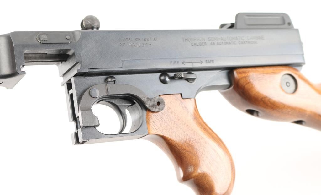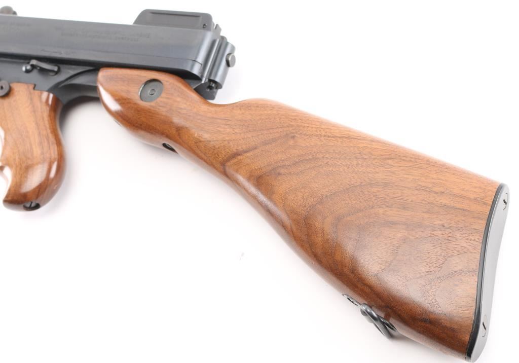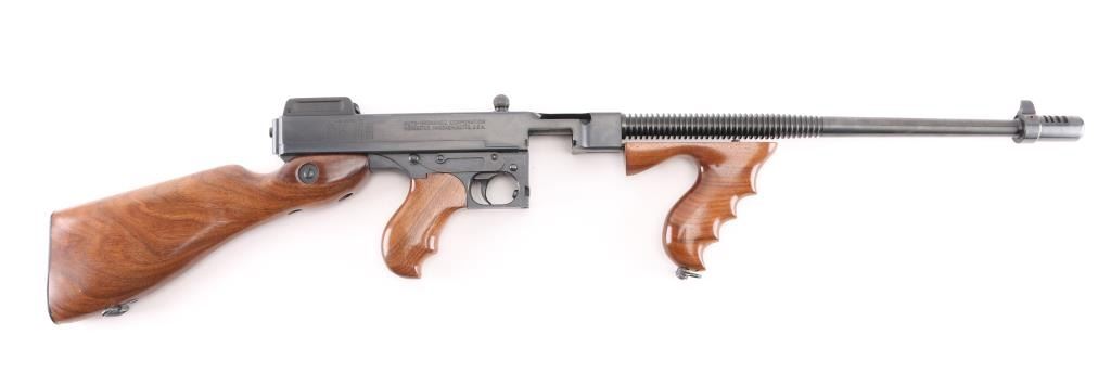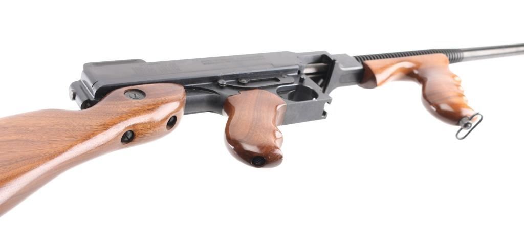 Semi-Automatic version of the Thompson Sub-Machine Gun. The "Chicago Typewriter". 18" finned barrel with pinned Cuts compensator. Blade front and flip ladder, adjustable rear sights. Blued finish with polished American Walnut fixed stock, and vertical foregrip. Steel buttplat. All correct Auto-Ordnance markings , including the "Thompson Trade Mark" bullet on the top receiver, and compensator. Sling swivel attached. Bore appears excellent/bright. Action is crisp/tight. Blue is about 98% with very minor edge wear. Wood is excellent. No magazine. NRA Condition-Excellent. Modern Firearm.
