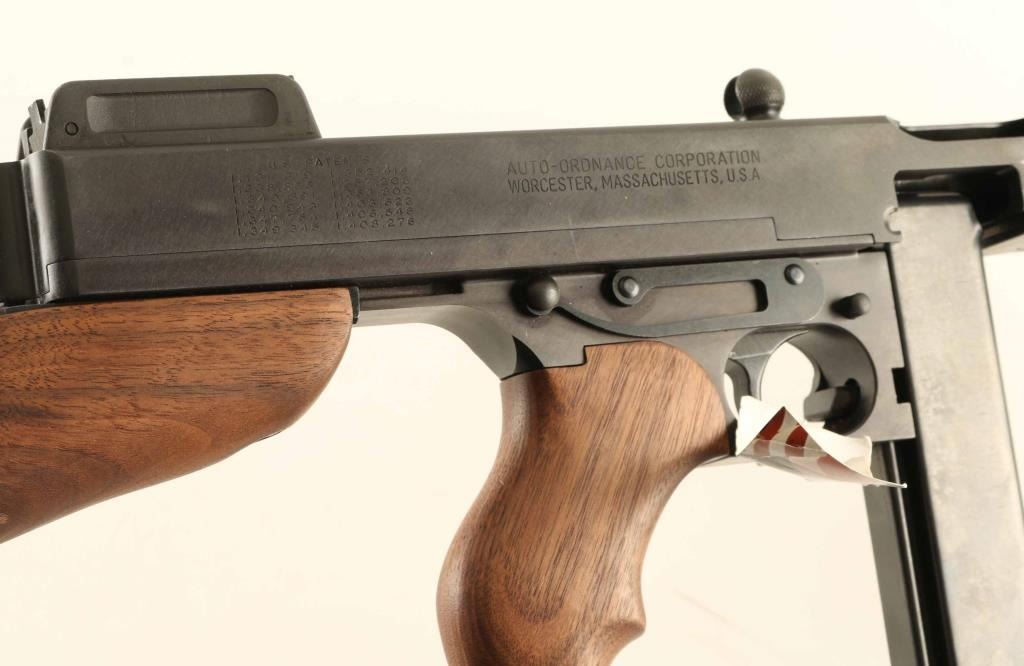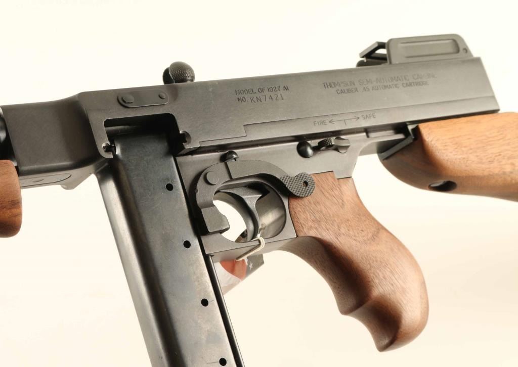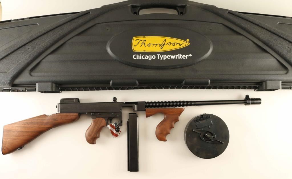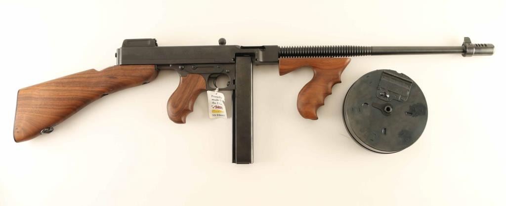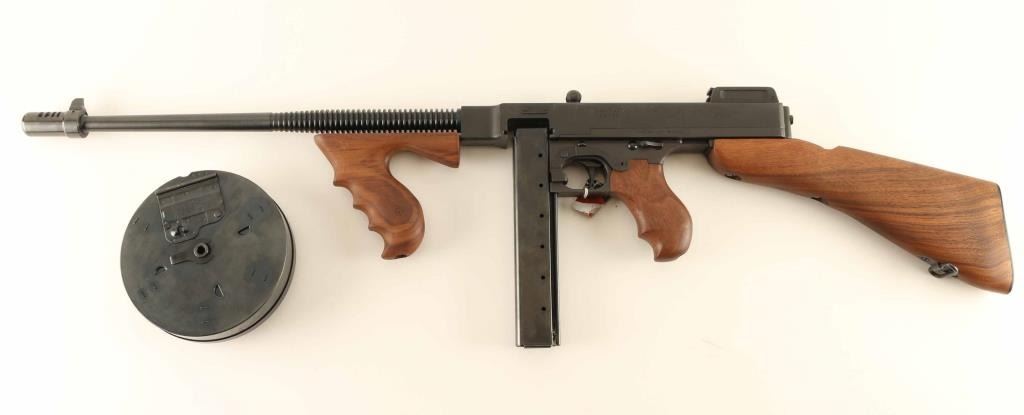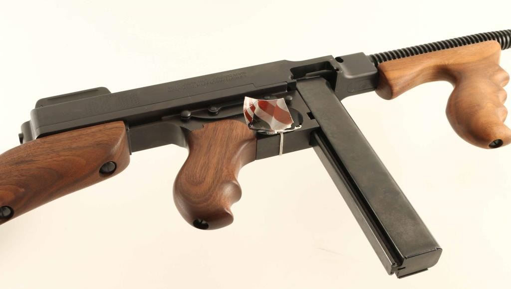 'Deluxe' Modern semi-automatic variant of the Thompson submachine gun chambered in .45 Auto. Features a blued finish, 16.5" finned barrel with Cutts style compensator, dovetailed blade front sight, flip-up ladder rear sight graduated to 600 yards, smooth trigger, knurled spherical charging handle, manual safety on the left side of the frame, steel receiver, 30 round stick magazine, walnut vertical foregrip with finger grooves, pistol grip and detachable shoulder stock with sling swivel & smooth metal buttplate. Includes a factory hard case with fitted foam interior, documents, lock, 50 round drum magazine and drum installation device. Rifle exhibits approximately 99% of it's original finish showing very little wear. Action is strong, the bore is pristine and wood stocks are fine Condition is near NRA Perfect in case. ***Modern Firearm***