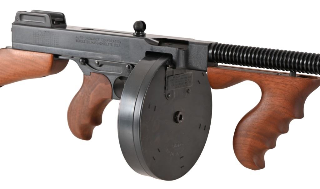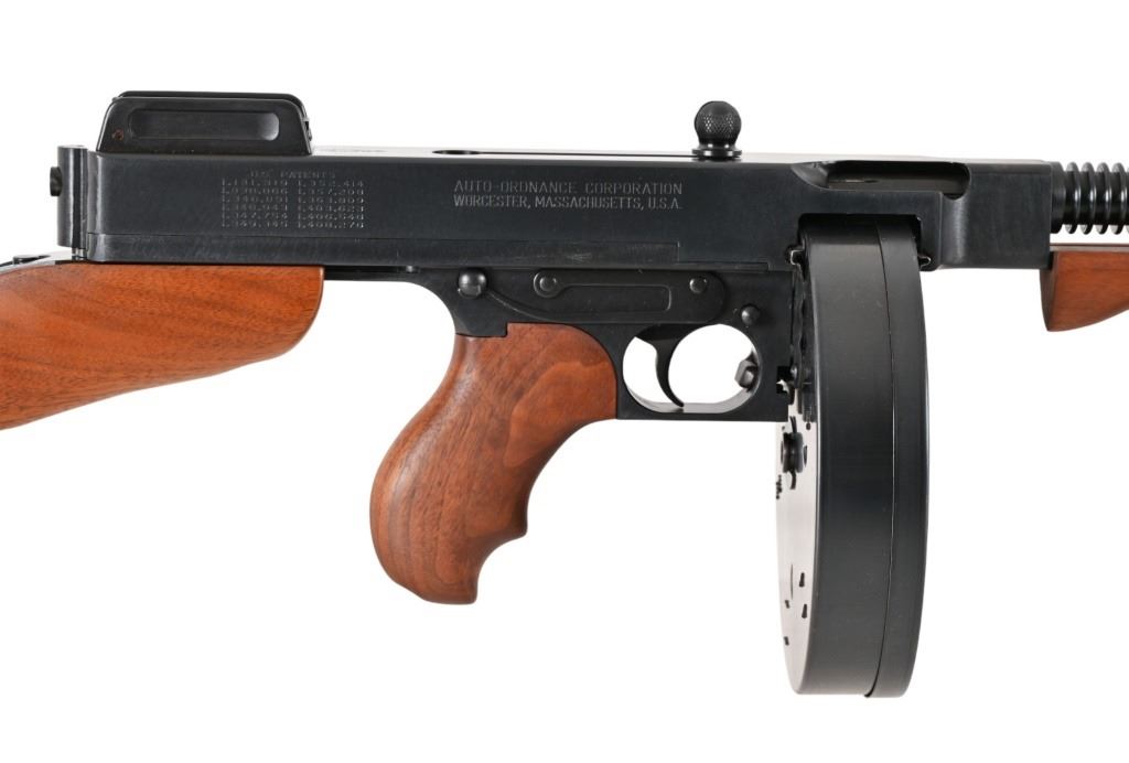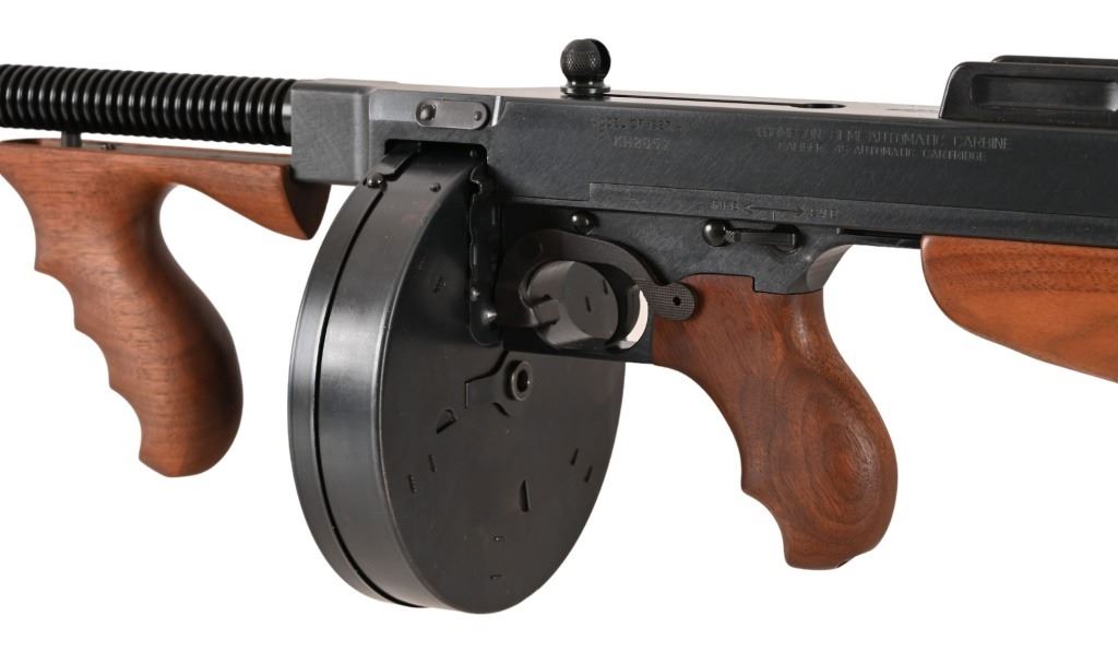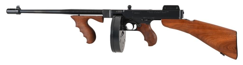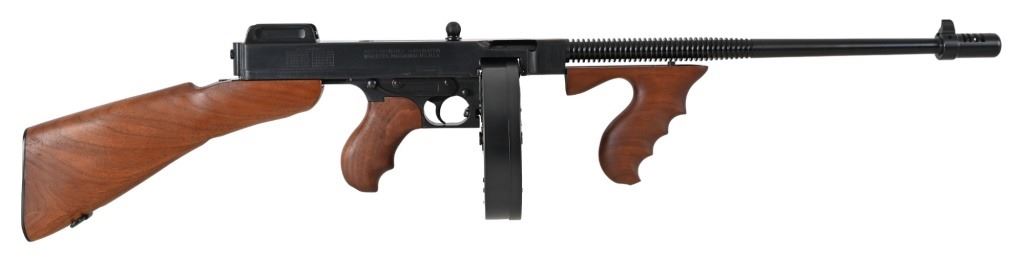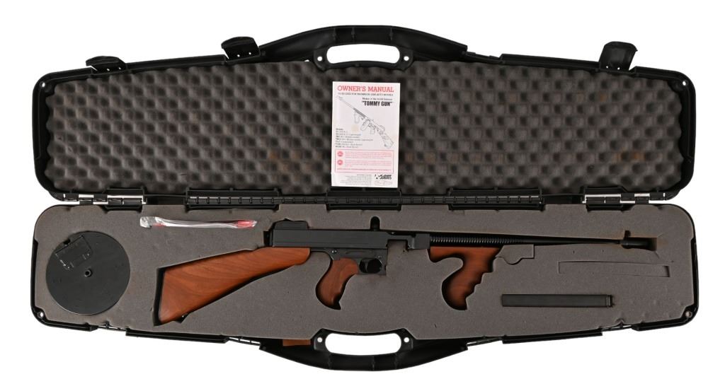 S/N KH2859.Barrel measures 16.5", with 2.5" pinned compensator. Very good condition, in original Thompson plastic hardcase, with stick and drum magazine. Modern.