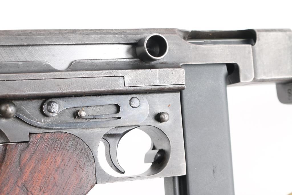 SN: 113842 1968 Amnesty registered, fully-transferable WWII era US Military Submachine Gun chambered in .45 Automatic. Though stamped, Auto-Ordnance Corporation, Bridgeport CT, this SMG was subcontracted to Savage Arms. The M1 was a simplified design from Savage for easier manufacture to meet wartime needs. The M1A1 was simplified even more with a fixed firing pin rather than being hammer fired like the M1. Most of the M1 Thompsons were “upgraded” to the M1A1 configuration, though this one remains unaltered, a scarce find.