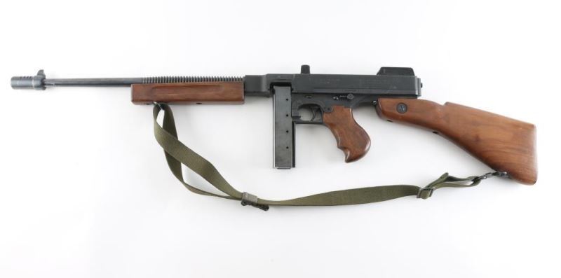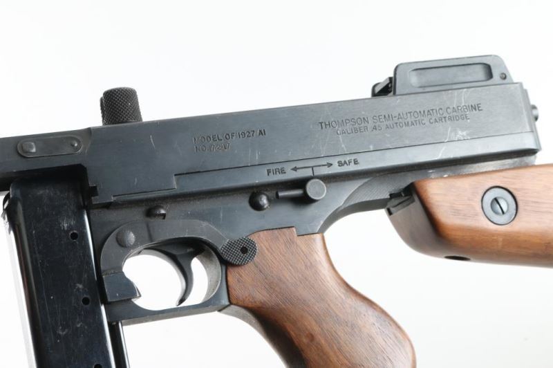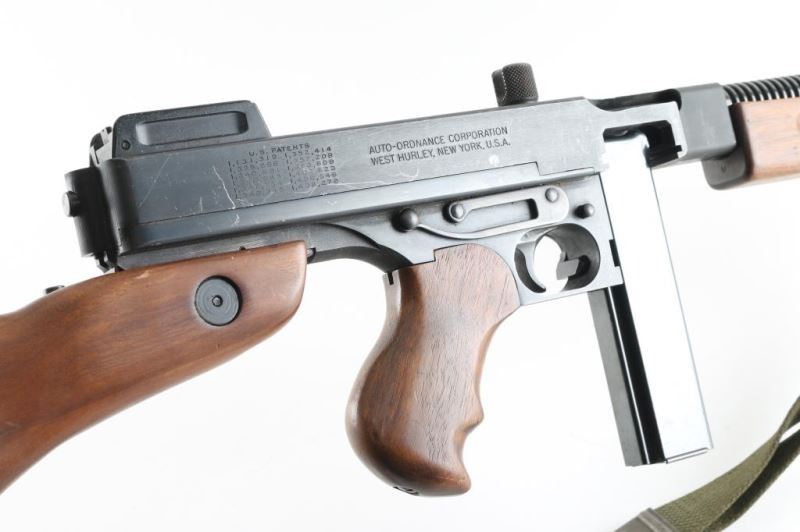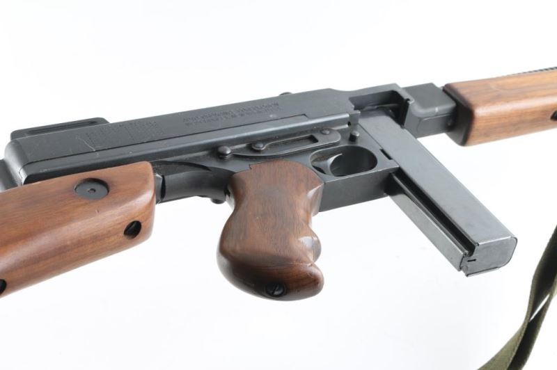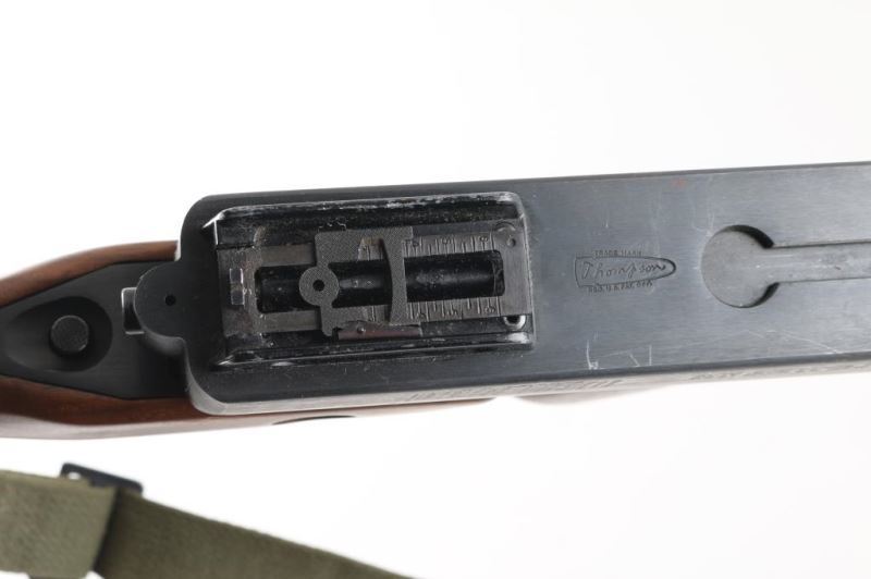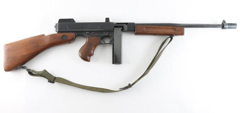 Rifle. Semi-Automatic. Styled after the Thompson 1927A-1 SMG. Correct Thompson markings on receiver. 16.5" contoured, finned barrel, with front blade, notch, peep rear sights. Cutts style compensator. Blued. Walnut pistol-grip, forearm, and stock. Steel buttplate. Sling swivels. Bore appears very good/bright, but a little dirty. Action is crisp/tight. Wood has a couple of minor scratches. Blued metal finish is about 97%, with minor scratches. green web sling attached. Includes a 20 round Seymour magazine. NRA condition-Very good. Modern firearm.