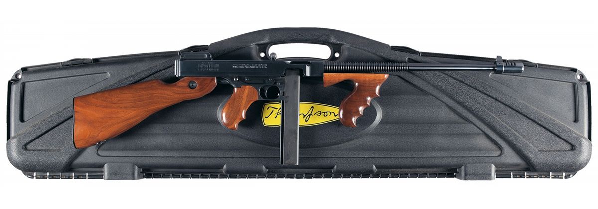 This is the contemporary closed bolt semi-automatic version of the famous Thompson Model 1927 A1 sub-machine gun. The receiver is marked "THOMPSON SEMI-AUTOMATIC CARBINE/CALIBER .45 AUTOMATIC CARTRIDGE" on the left side with the Auto-Ordnance address on the right side. Fixed blade front sight and adjustable lyman type rear sight. Standard features and complete with hard case and extra 50 round drum magazine. Also included is wood display stand magazine loading device with shipping crate.