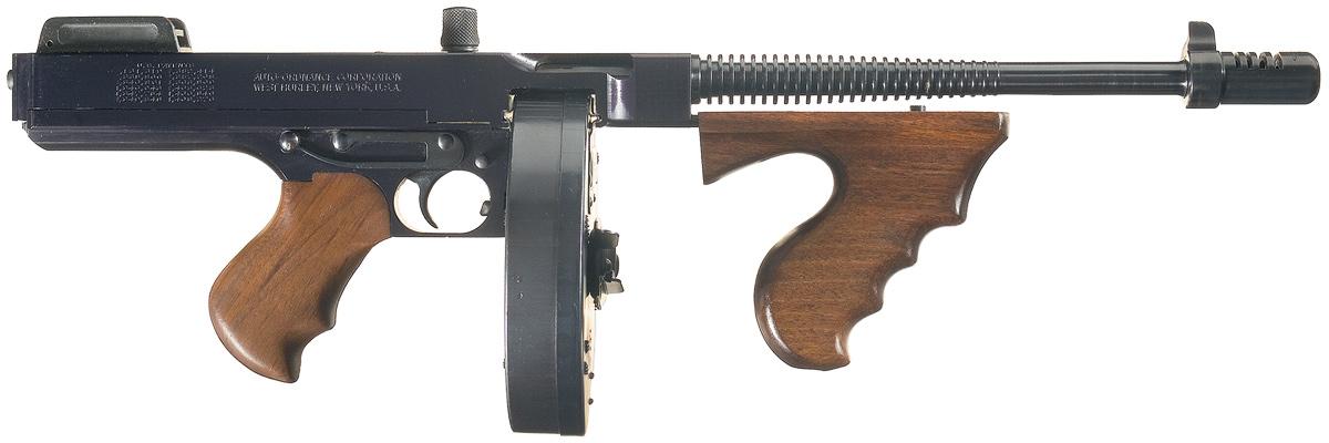 This is a pistol version of the 1927 Thompson that was made without a stock. It has a blade front and folding elevator rear sights, with a Cutts-style muzzle compensator, ribbed barrel, and standard markings on the receiver. Closed bolt operation, with a 10 round "Type X" drum magazine. Contoured "civilian" style front pistol grip and finger grooved rear grip. With a guitar-style case and papers.