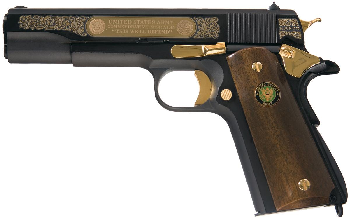 This pistol commemorates the U.S. Army and features gold etched scroll designs and commemorative markings. Gold trigger, slide stop, thumb safety, magazine release, hammer and grip screws with blue on the remaining parts. Fitted with high gloss smooth walnut grips with U.S. Army medallions. Complete with a black plastic Auto Ordnance case numbered to the gun, cable lock and papers.