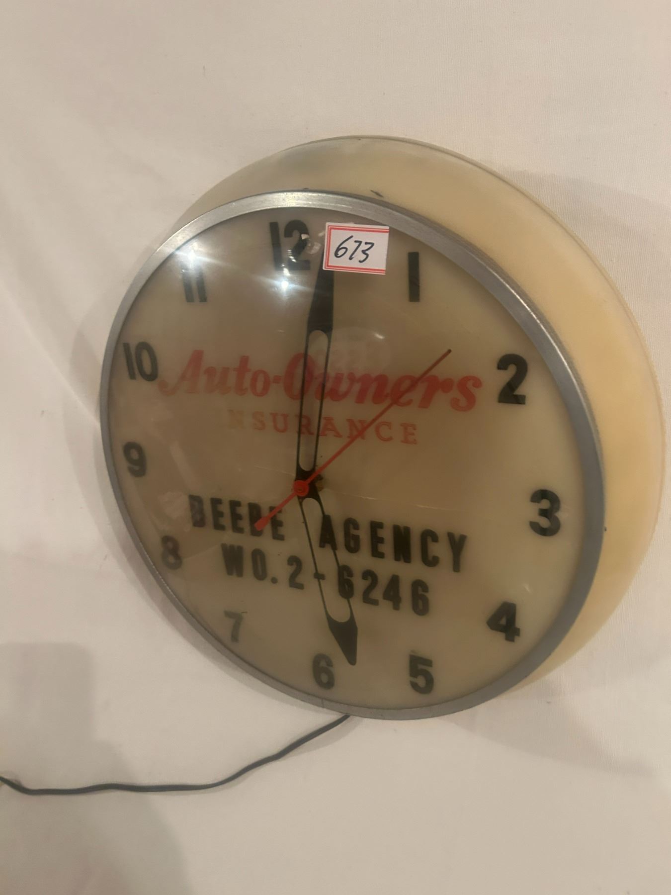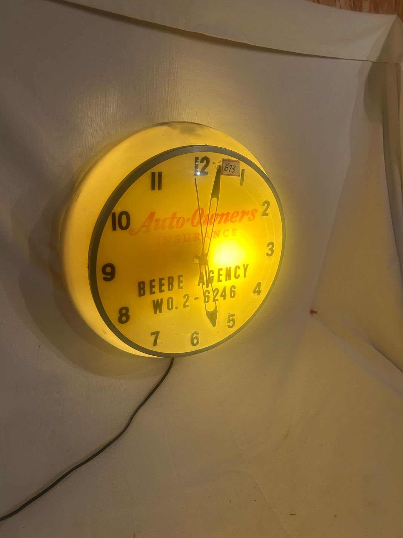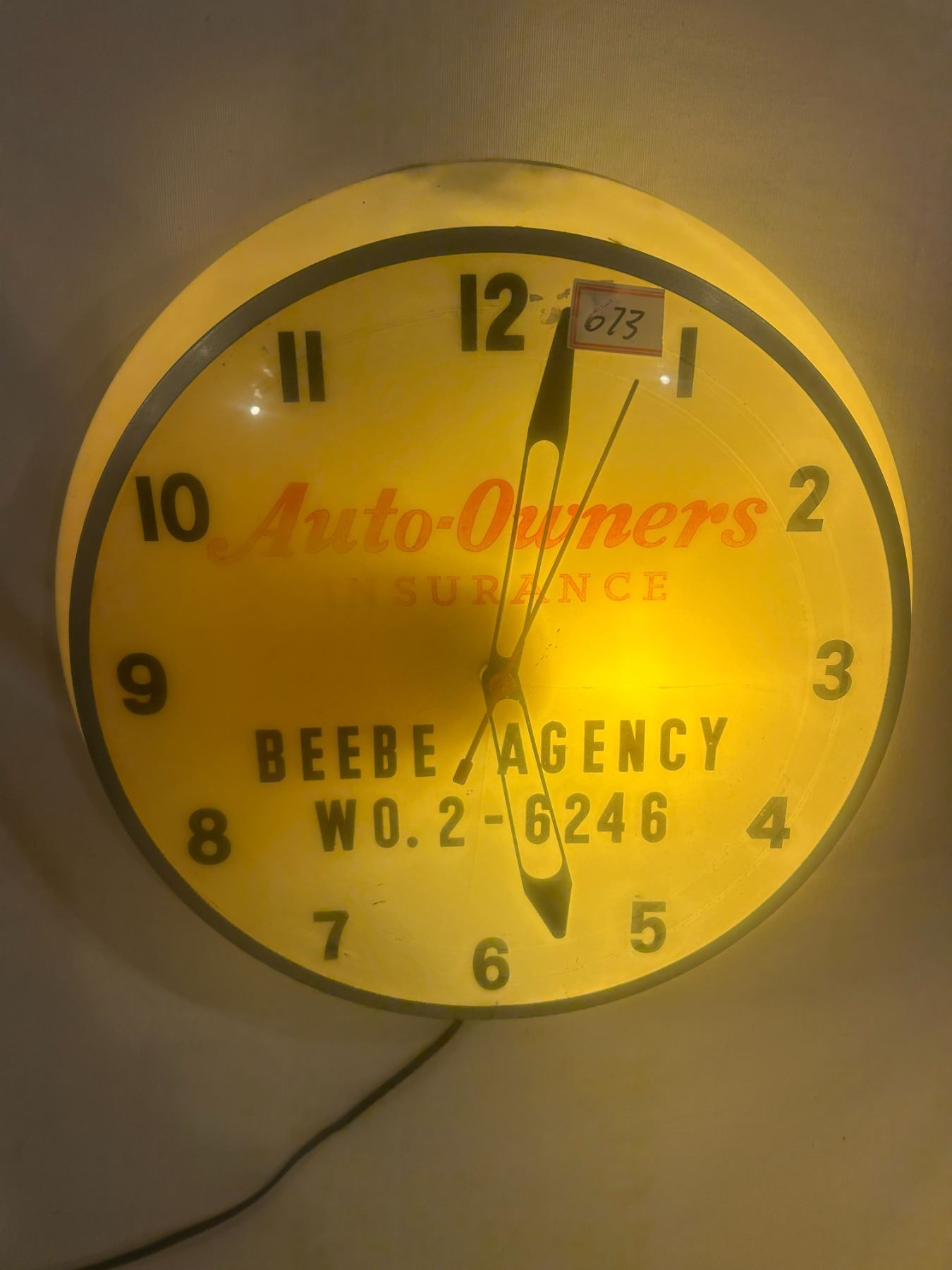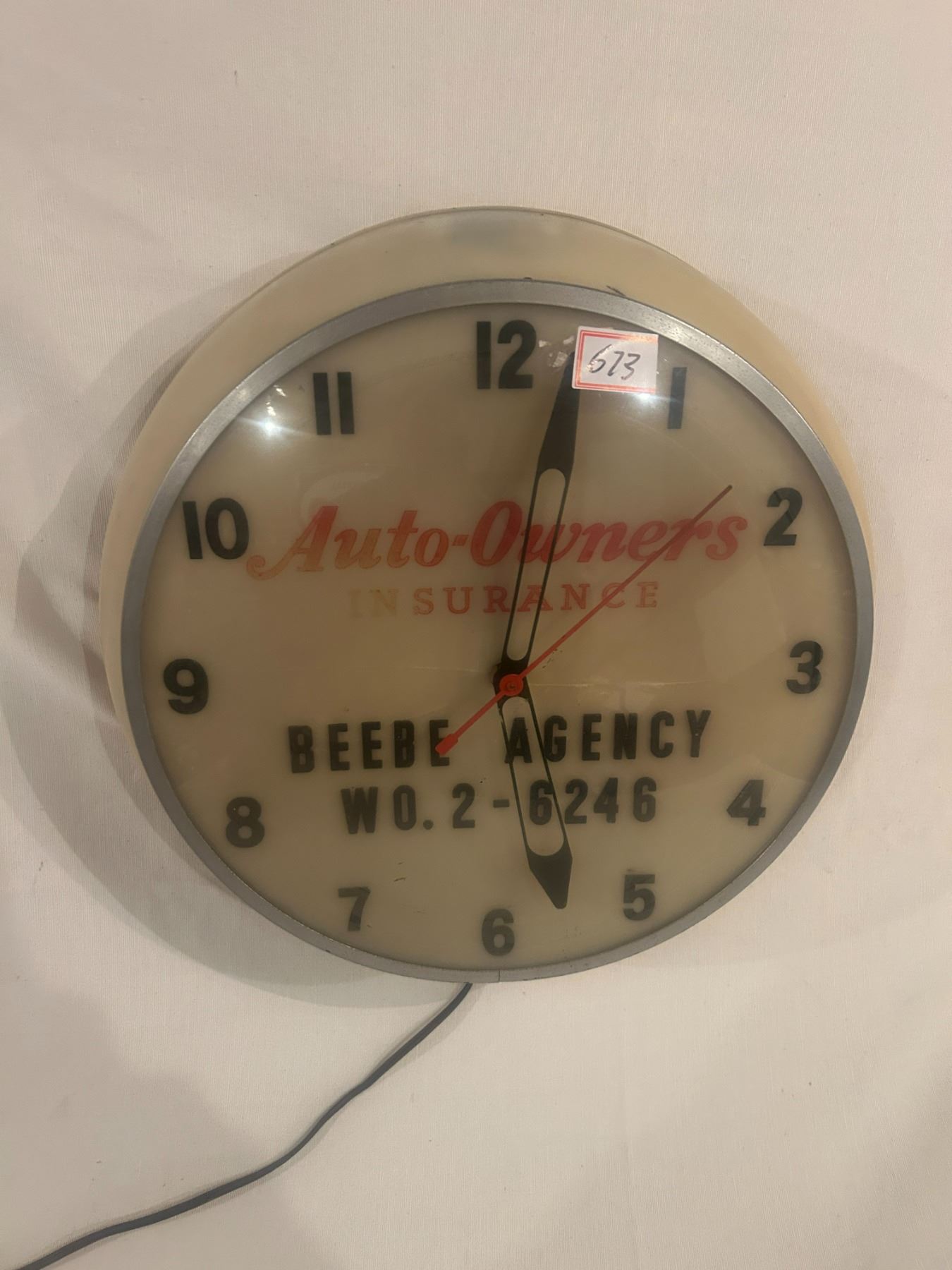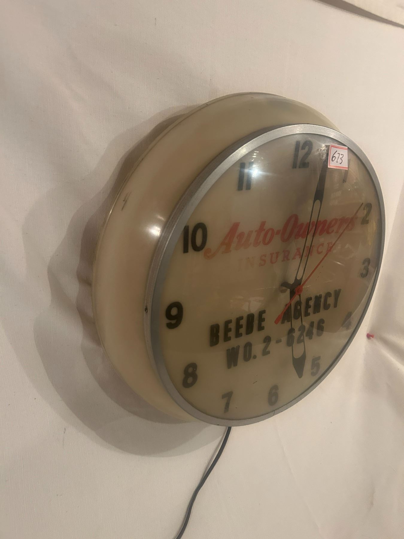 Auto Owners Insurance clock - Beebe Agency, 14" across, working