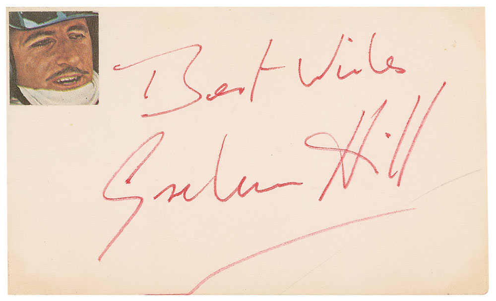 Two felt tip signatures, “Best wishes, Graham Hill” and “Stirling Moss,” on individual 3 x 5 cards. A small picture of Hill is affixed to the top left corner of the card. In fine overall condition.